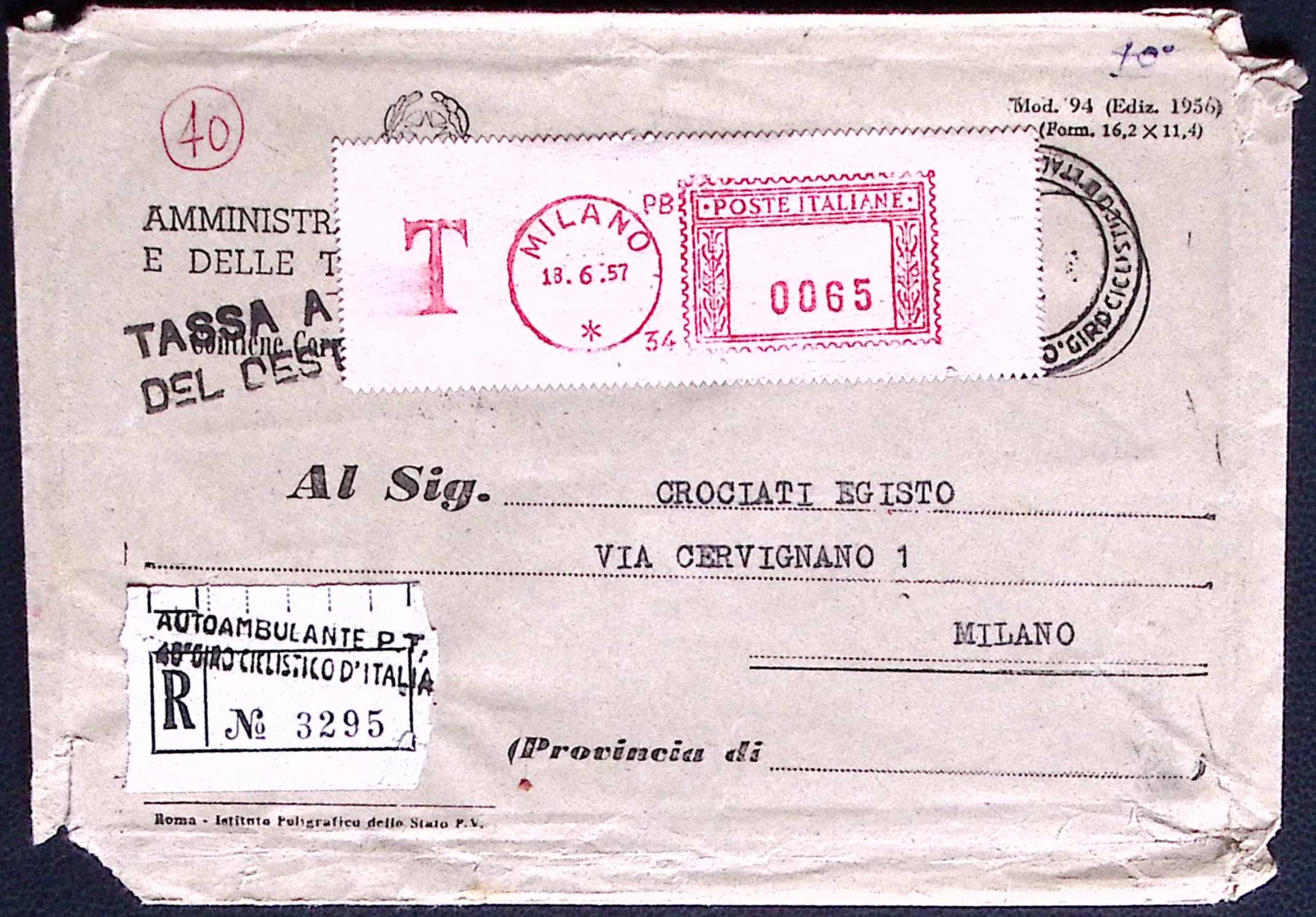 1957-tassazione affrancatura meccanica rossa su striscia gommata apposta su mod.94 raccomandata con autoambulante P.T. 40^ giro Autociclistico d'Italia