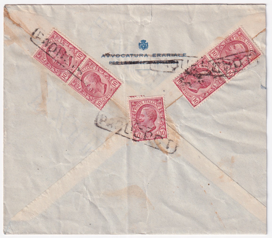 1925-PAQUEBOT cartella unico annullatore su busta per Rodi affrancata al verso singolo e due coppie Leoni c.10