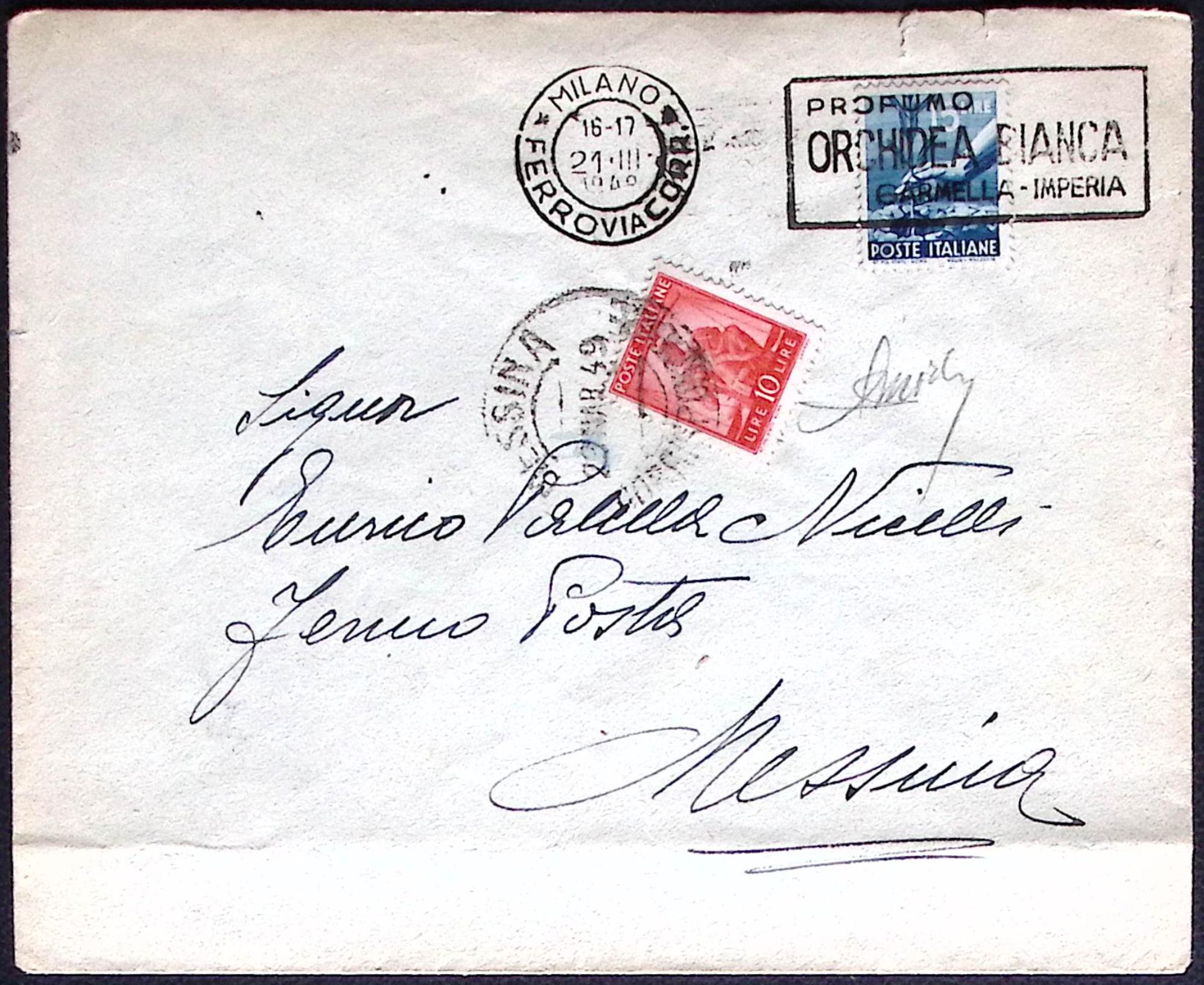 1949-lettera affrancata L. 15 per fermo posta in Messina tassata in arrivo con L. 10 Democratica uso segnatasse,rara
