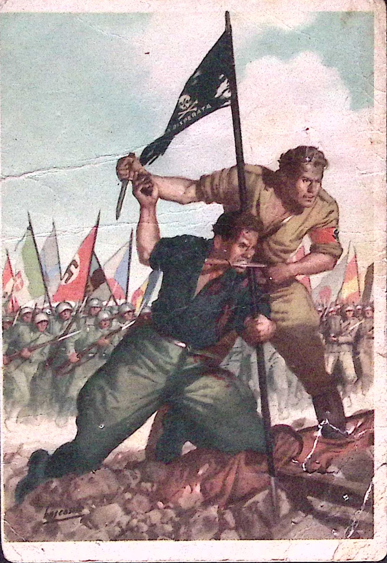 1942-CARTOLINA FRANCHIGIA La disperata, dis Boccasile, viaggiata PM 99 (11.12) segni spillo pieghe