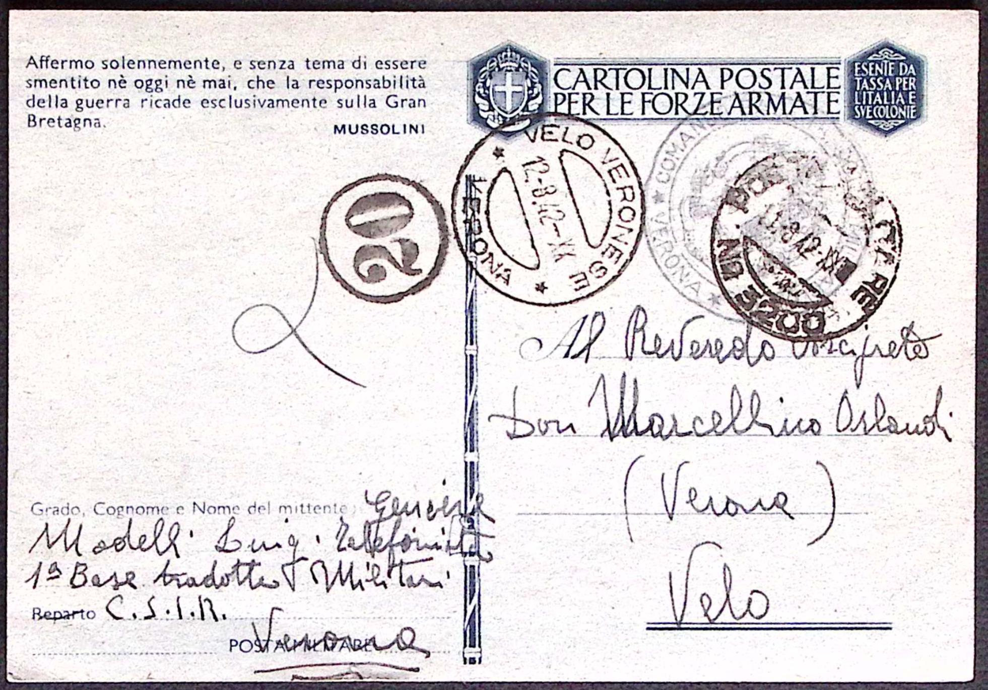 1942-1^ BASE TRADOTTE MILITARI CSIR manoscritto su cartolina franchigia PM 3200 (11.8)