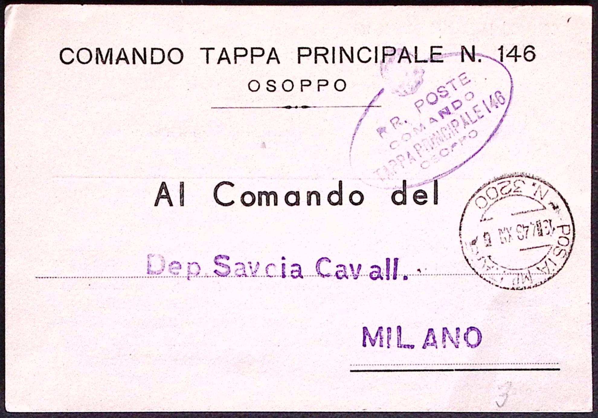 1943-COMANDO TAPPA PRINCIPALE N.146/OSOPPO intestazione a stampa e tondo su cartolina servizio PM 3200 (13.4) Dichiarazione di periodo contumaciale di rimpatriato dalla Russia