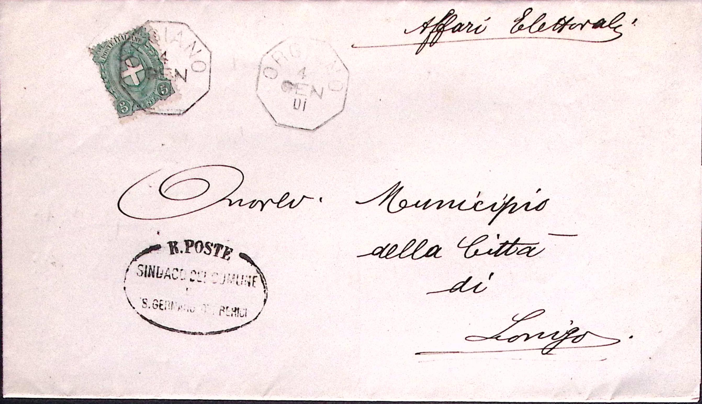 1901-ORGNANO ottagonale di collettoria (4.1) su piego affr. c.5