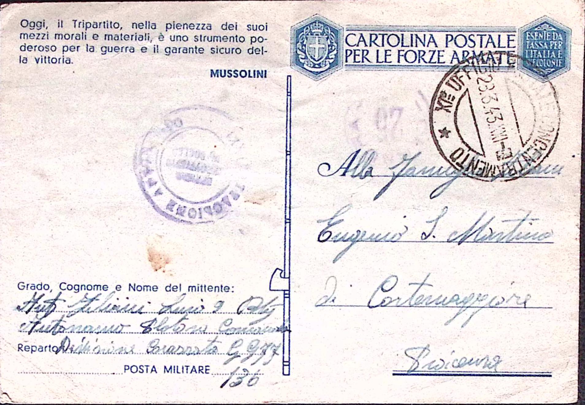 1943-XI UFFICIO POSTALE CONCENTRAMENTO C2 (23.3) e manoscritto PM 136 (battaglia Mareth) si cartolina franchigia pieghe
