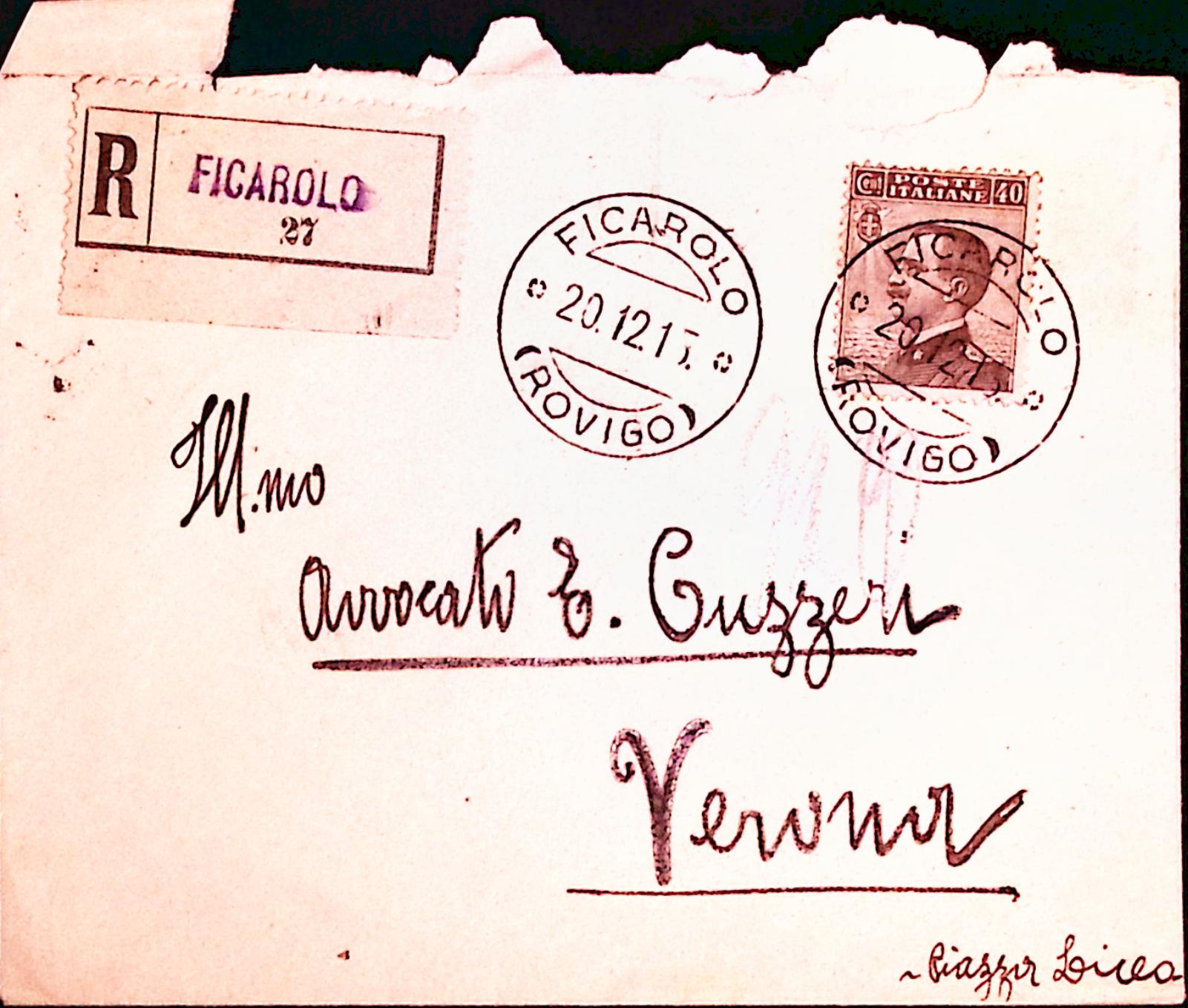1915-Michetti c.40 isolato su raccomandata Ficarolo (20.12)