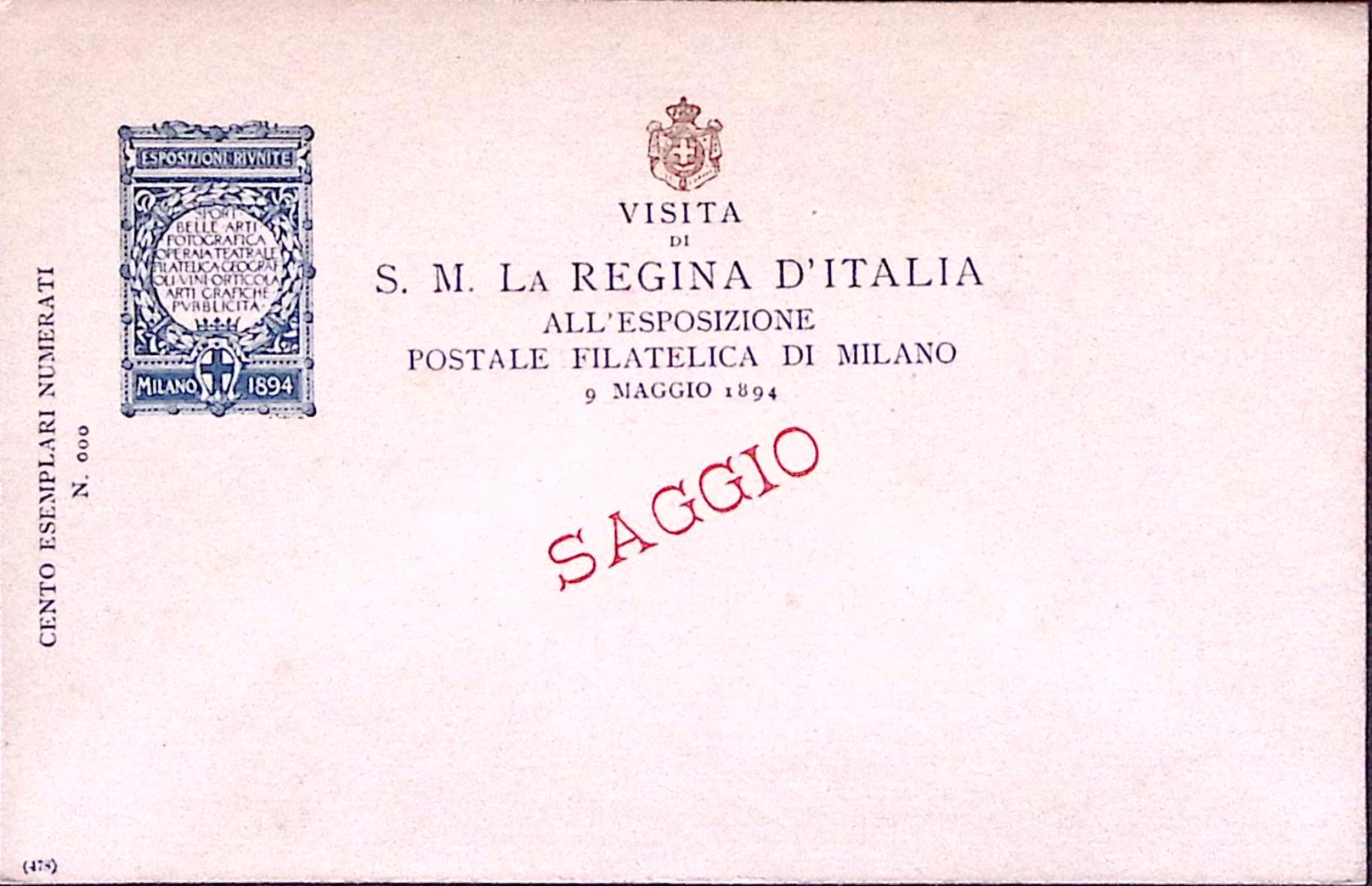 1894-CARTOLINA COMMEMORATIVA Medaglia esposizione filatelica nuova con soprastampa in rosso SAGGIO