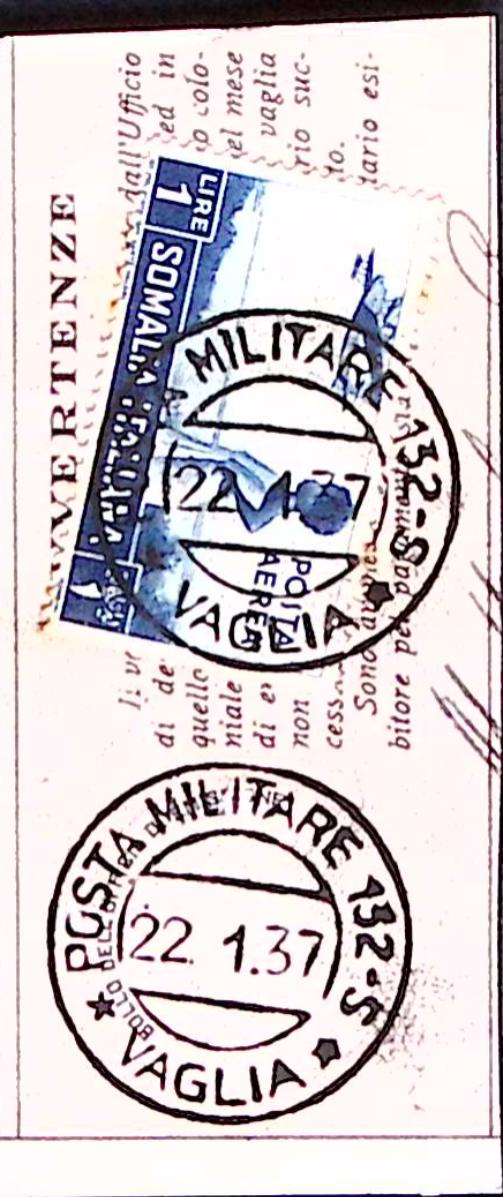 1937-Posta Militare 132 S/VAGLIA C.2 (22.1) su polizzino vaglia affrancato Somalia PA lire 1