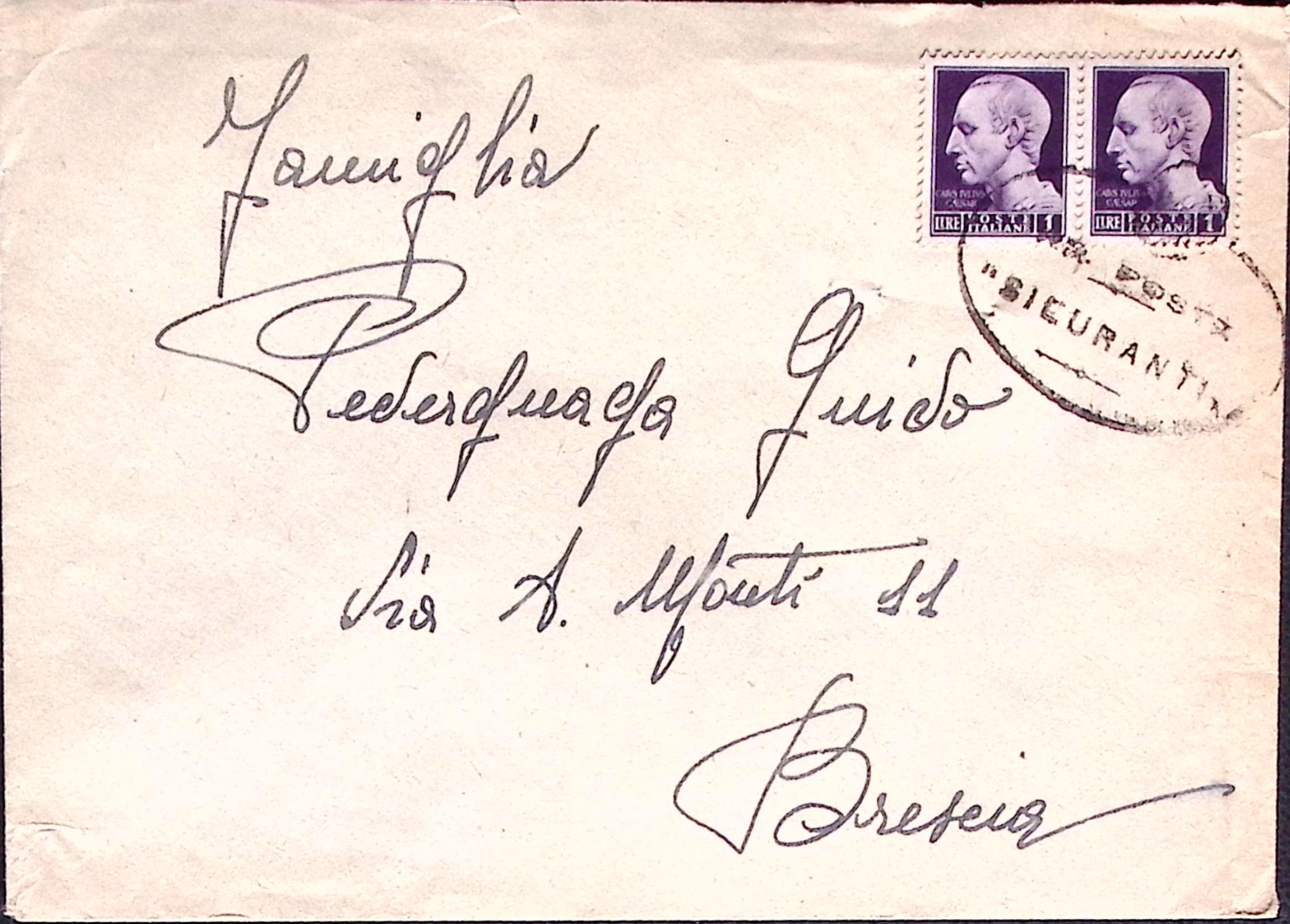 1945-R./Siluranti ovale viola unico annullatore di Imperiale s.f. coppia lire 1 su busta al verso a stampa R.T.Animoso