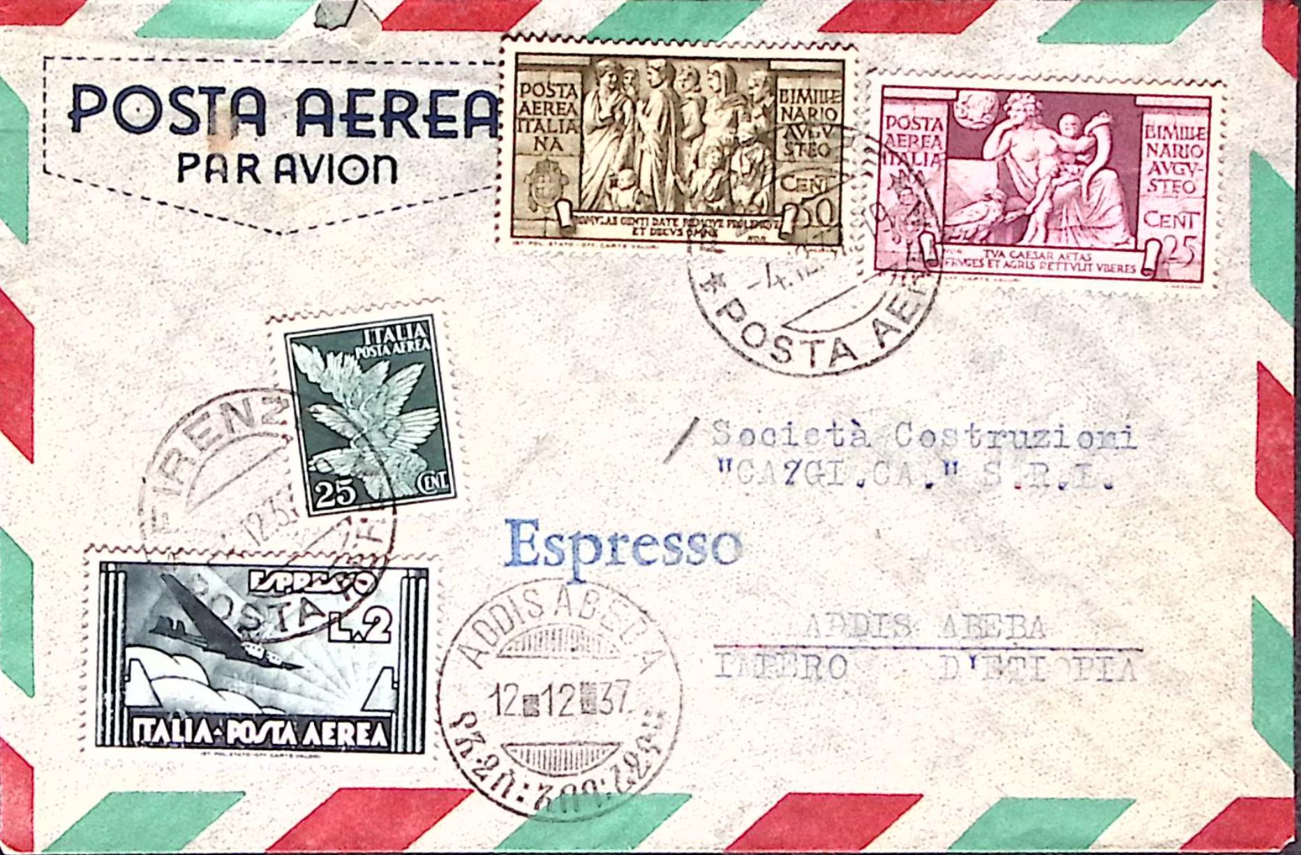 1937-P.A. AUGUSTO c.25 e c.50 +P.A. c.25 e lire 2 su busta via aerea Espresso Firenze (4.12) per Addis Abeba