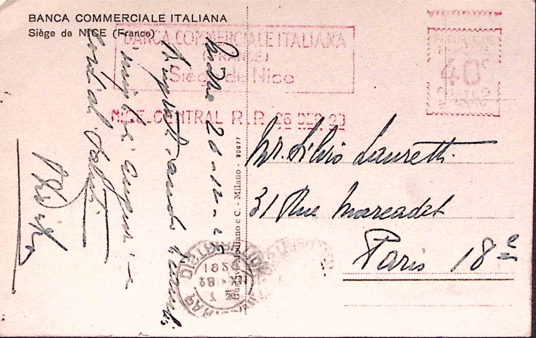 1925-BANCA COMMERCIALE ITALIANA / FRANCE Sage de Nice c.40, annullo meccanico rosso, su cartolina (Sede di Nizza)