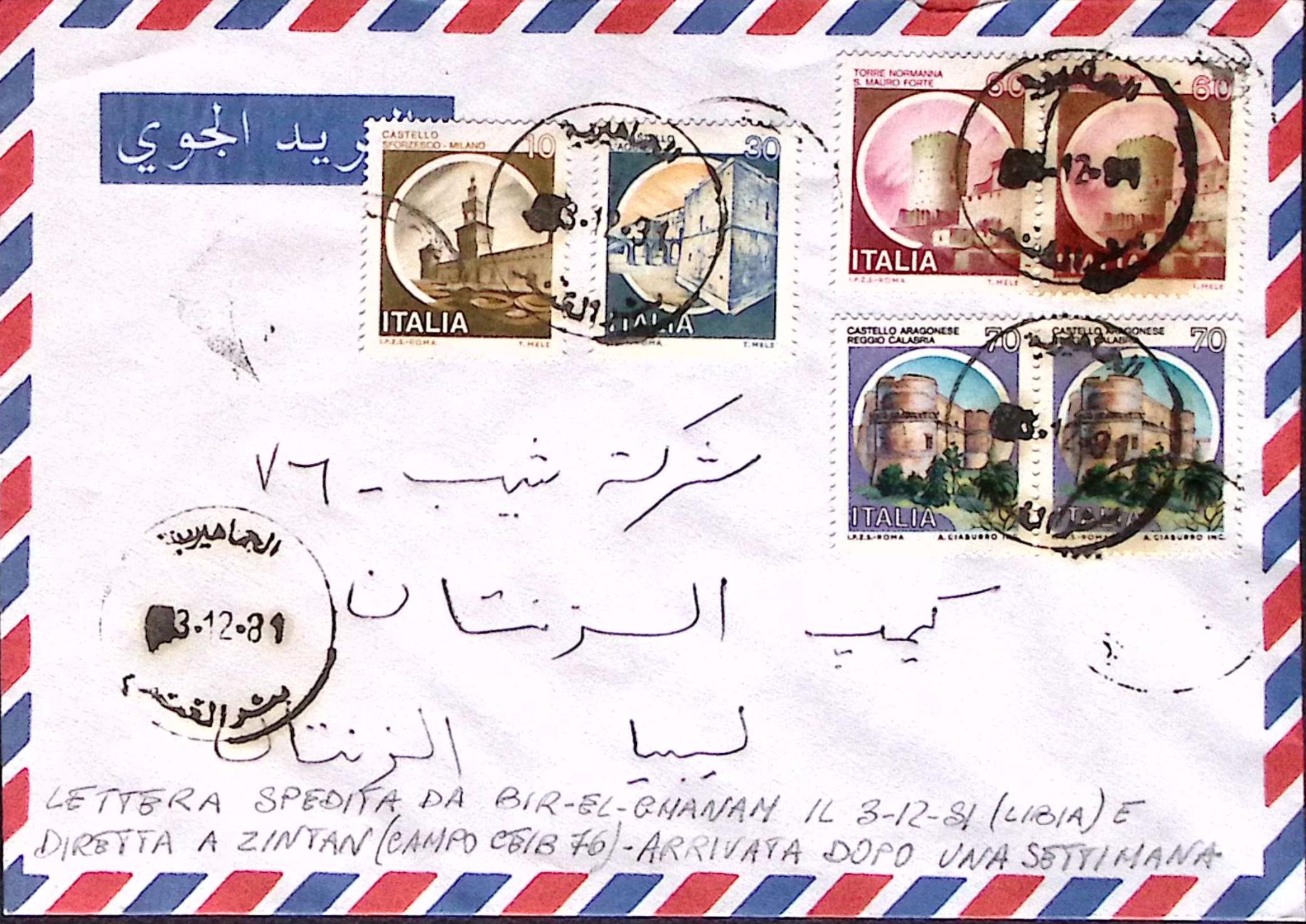 1981-CASTELLI lire 10 e 30 + coppie lire 60 e 70,su busta Bir-El-Ghanam (3.12) (Libia) con al verso francobollo libico. Uso eccezionale francobolli italiani in Libia
