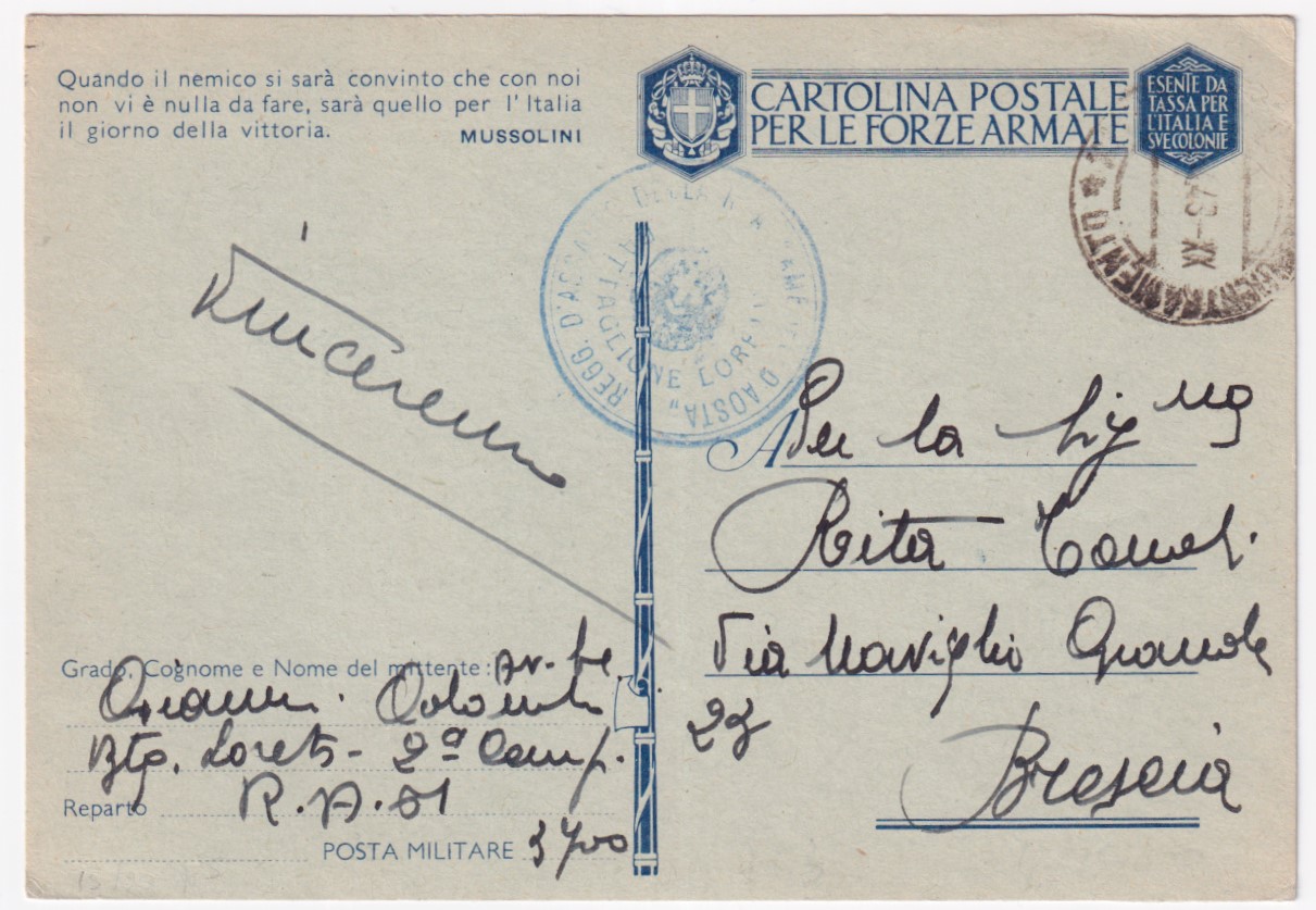 1943-RGT. ASSALTO Regia Aeronautica/BTG LORETO tondo e manoscritto su cartolina franchigia XI UCPM (9.4)