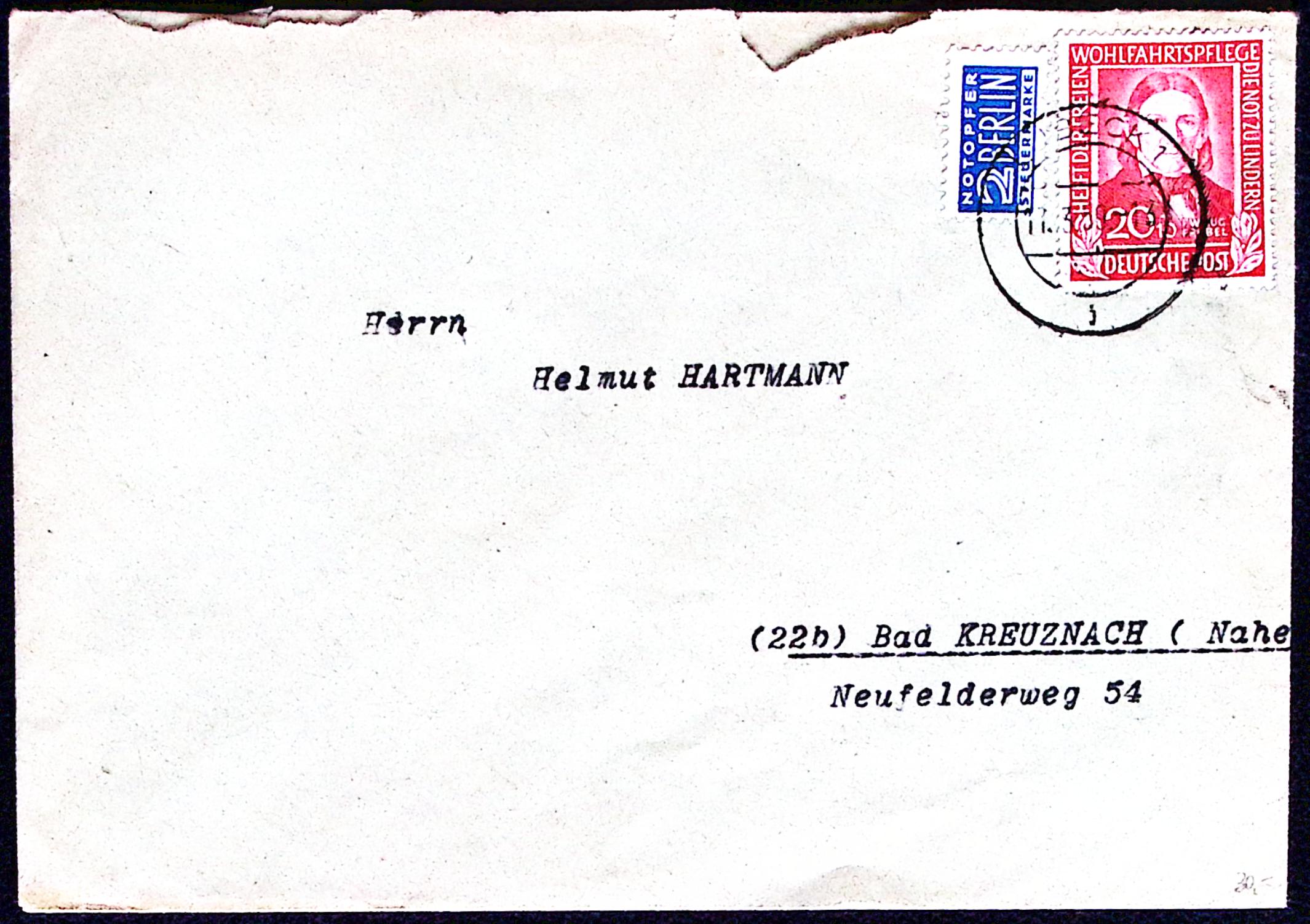 1950-Germania lettera affrancata 20+10pf. Frobel isolato