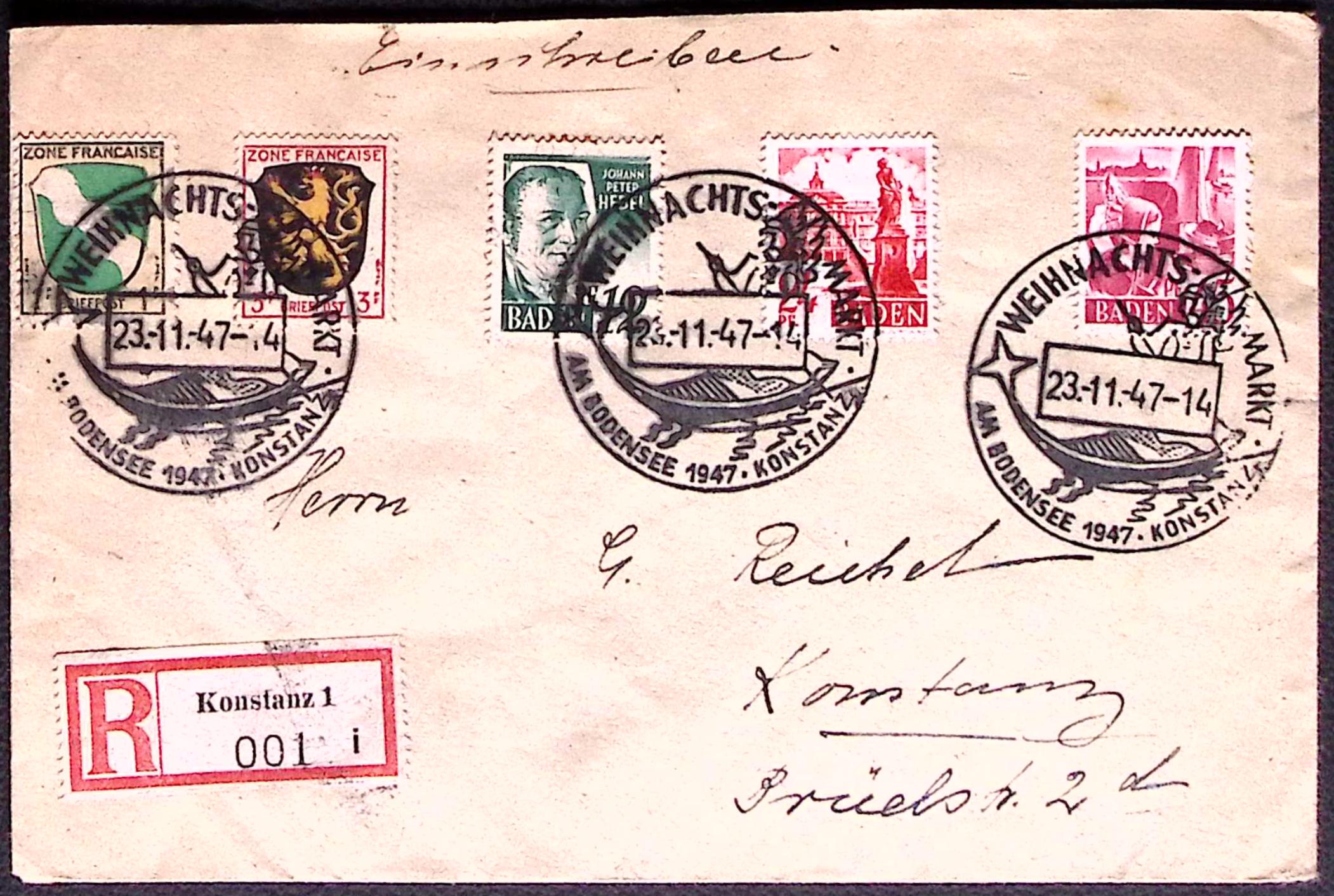 1947-Germania Baden raccomandata annullo Weinachts Markt am bodensee Konstanz con rara affrancatura