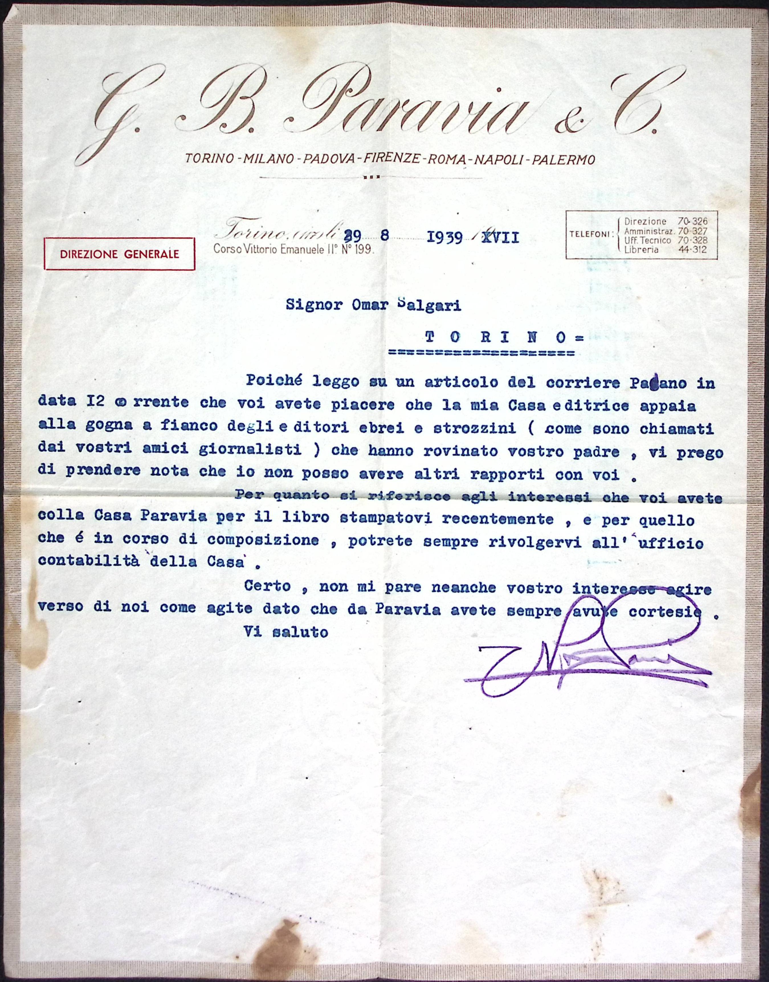 1939-lettera con intestazione e firma Paravia diretta a Omar Salgari