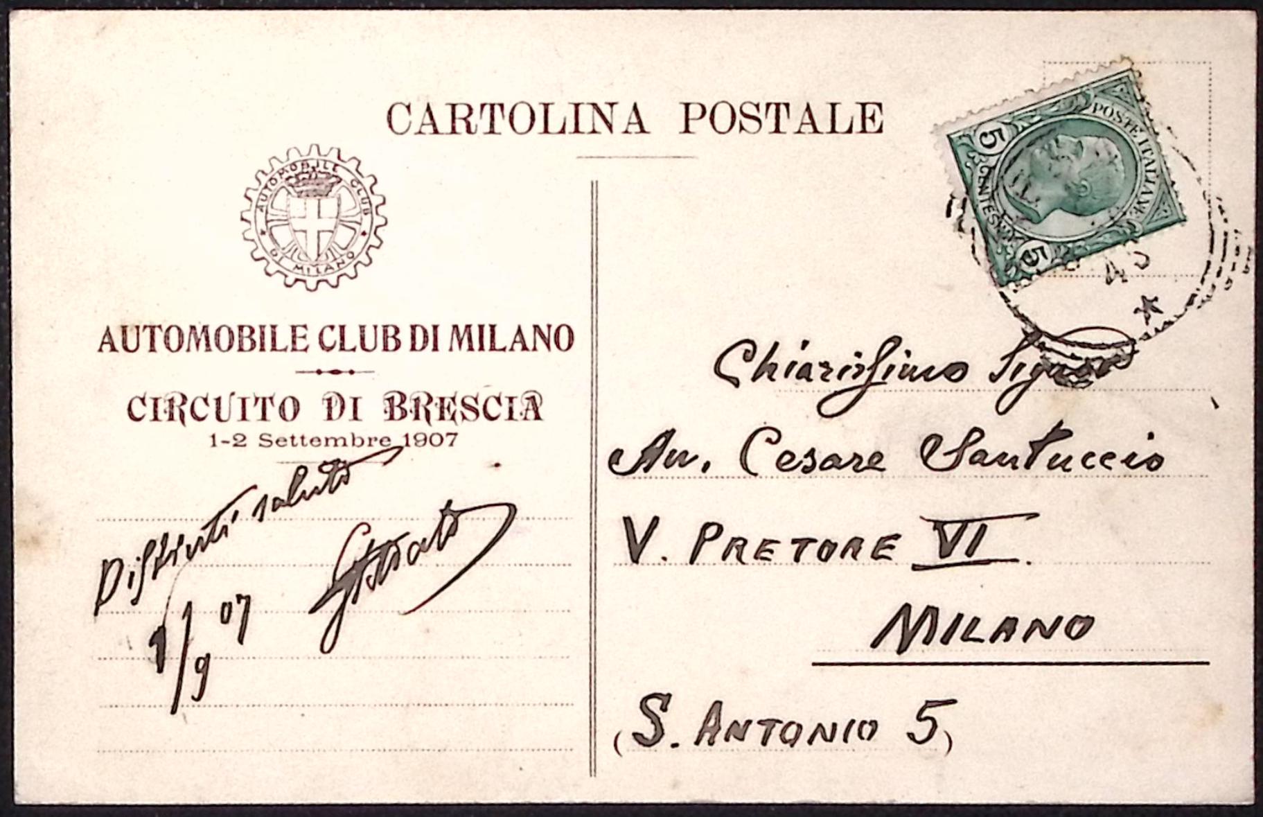 1907-Automobile club Milano circuito di Brescia cartolina viaggiata con tracciato evidenziato in rosso
