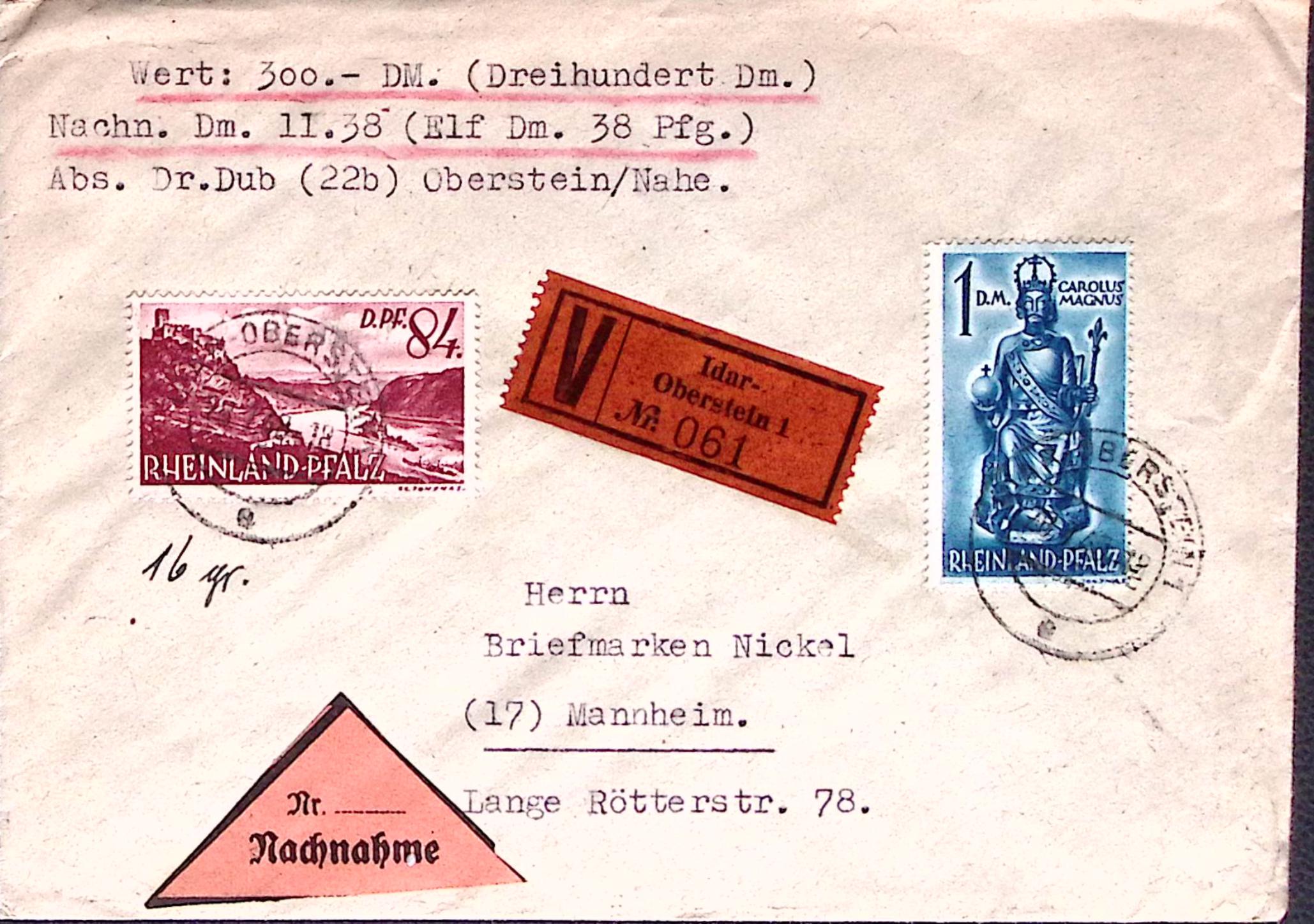 1949-Germania Renania Palatinato assicurata per 300 M. con pregevole affrancatura