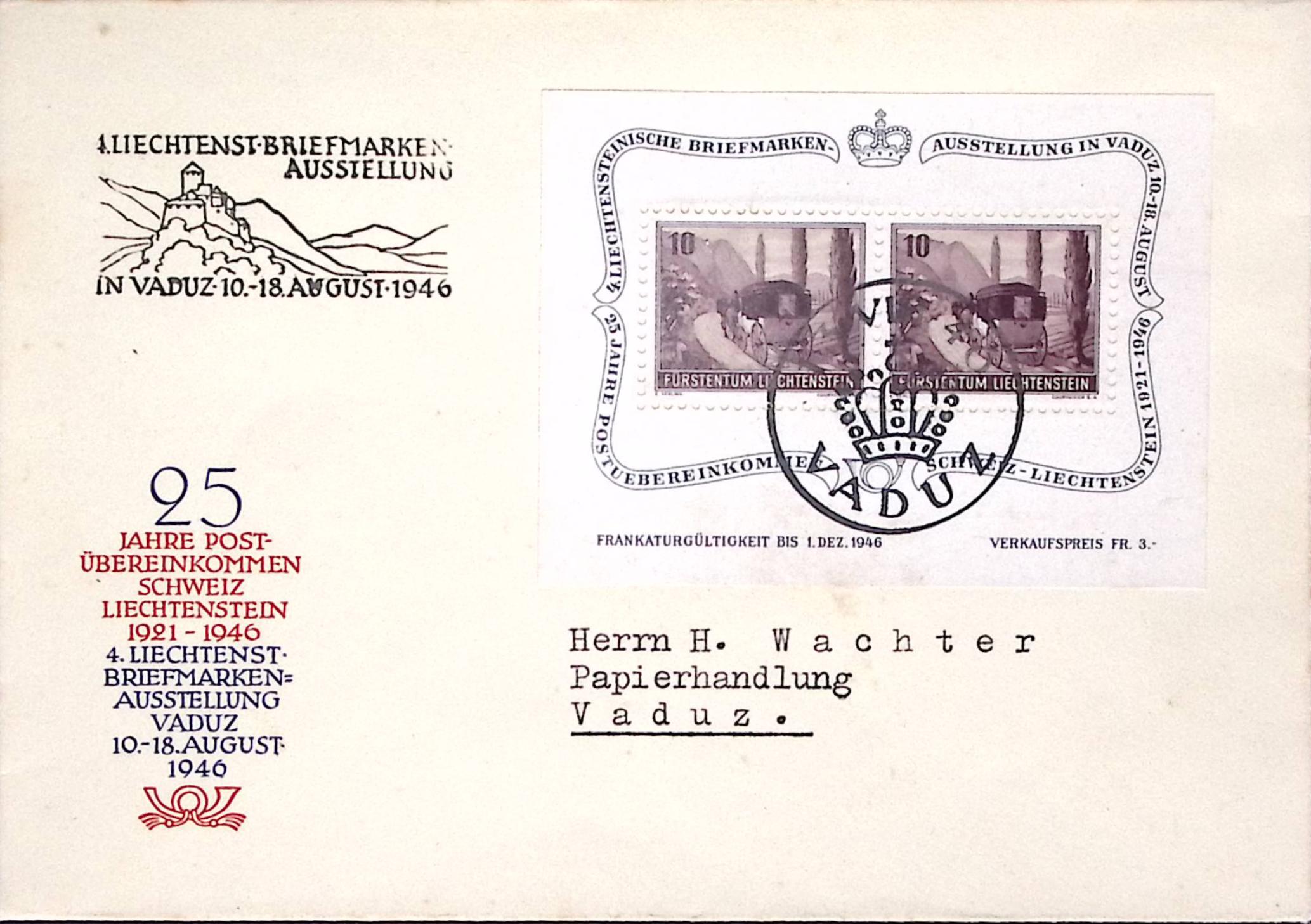 1946-Liechtenstein foglietto 2 valori esposizione filatelica Vaduz su fdc
