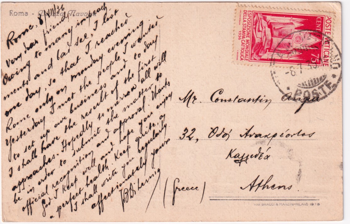 1936-VATICANO Stampa Cattolica c.75 dentino d'angolo corto (51) isolato su cartolina (8.7) per la Grecia