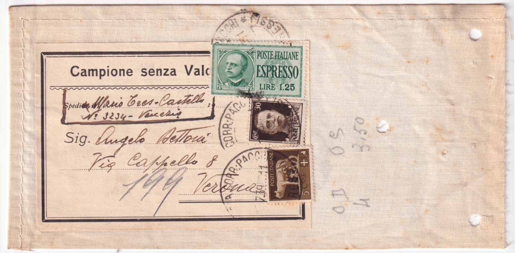1939-CAMPIONE SENZA VALORE espresso sacchetto in tela completo affrancata Imperiale c.5 e 30 + Espresso lire 1,25 Venezia (6.7)