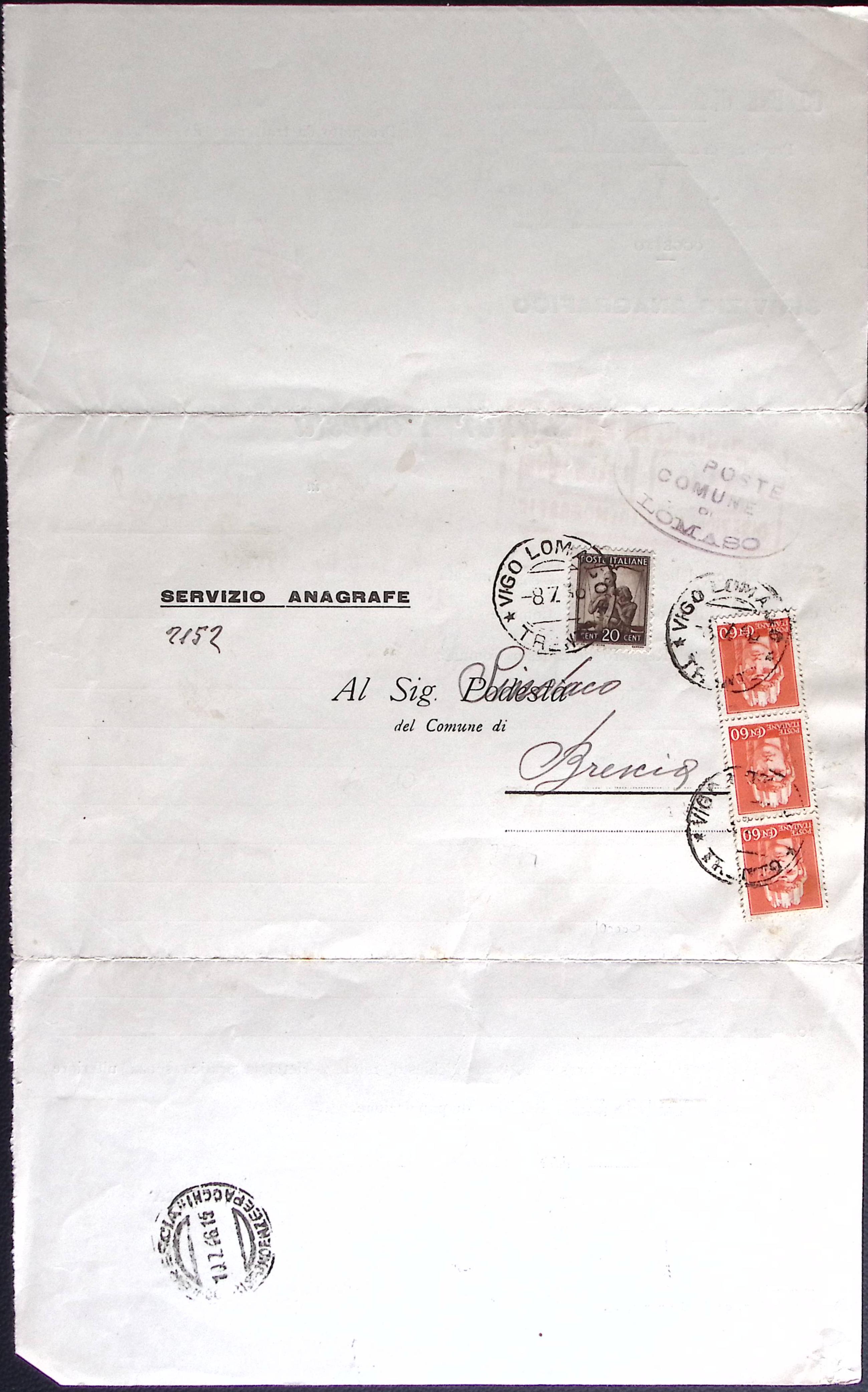1946-striscia 60c.Imperiale senza fascio + 20c. Democratica su piego comunale Vigo Lomaso Trento 8.7
