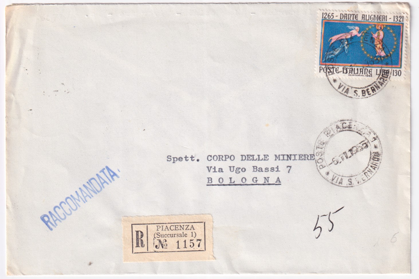 1965-DANTE ALIGHIERI lire 130 (1006) isolato su raccomandata Piacenza (6.11)