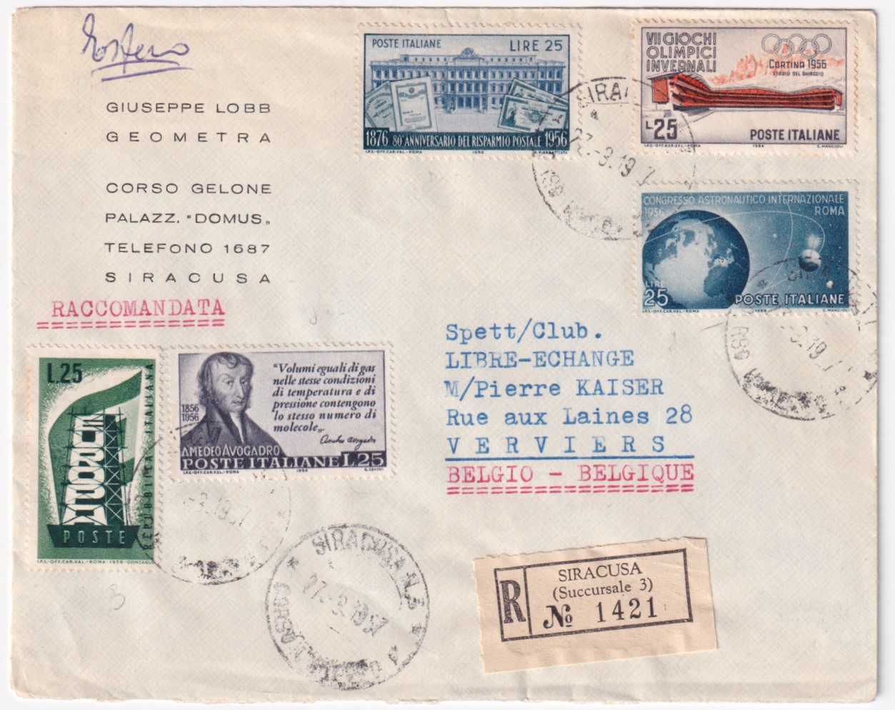 1957-AVOGADRO + RISPARMIO POSTALE + CONGRESSO ASTRONAUTICO + EUROPA1956 lire 25 + Giochi Invernali lire 25 su raccomandata Siracusa (27.3) per il Belgio. VALORI GEMELLI