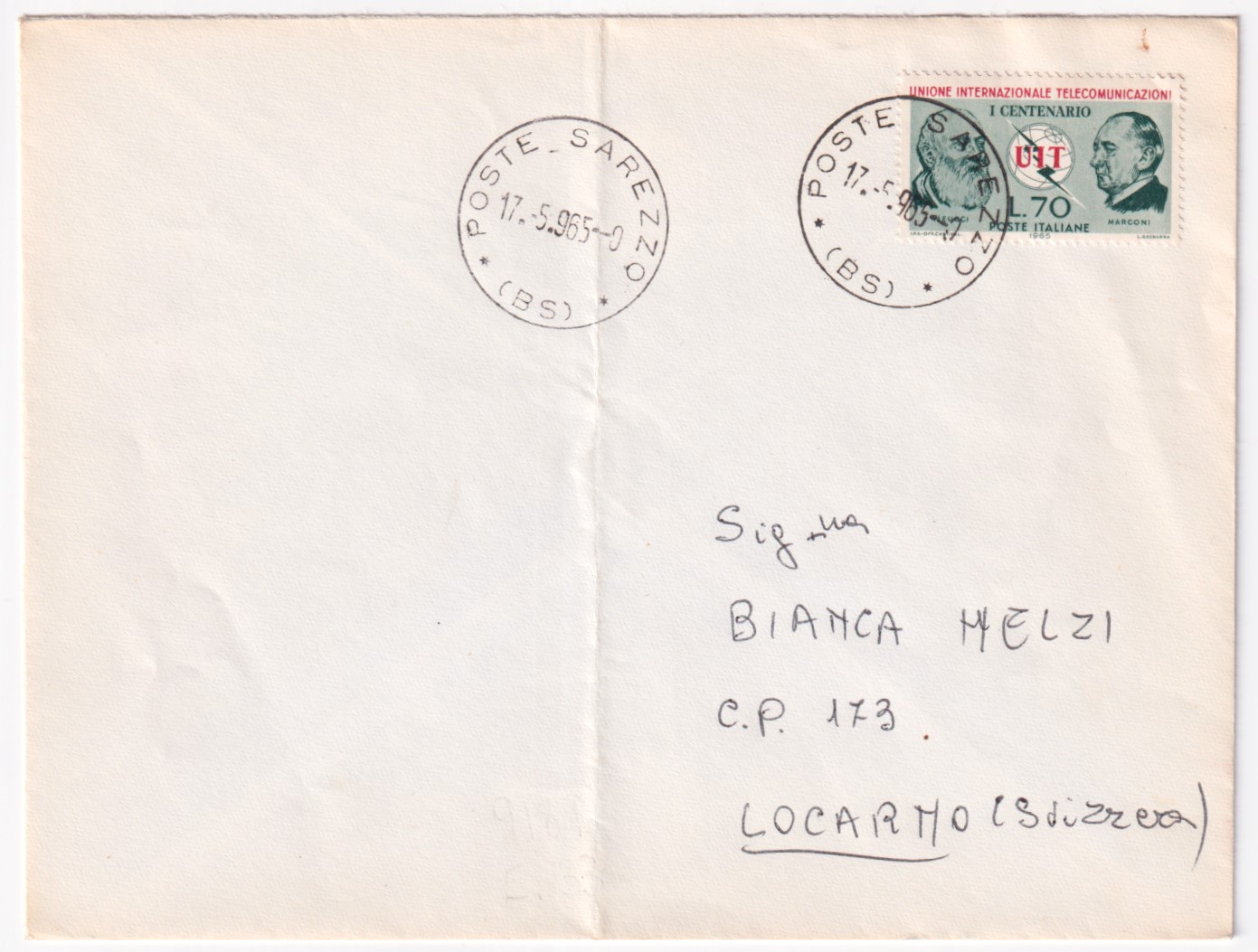 1965-UNIONE INTERNAZIONALE TELECOMUNICAZIONI (996) isolato su busta Sarezzo (17.5) per la Svizzera