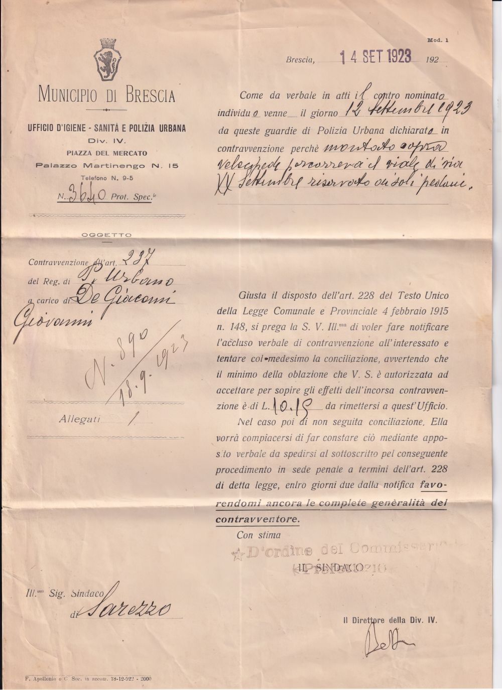 1923-Brescia verbale di contravvenzione del 14.9 a ciclista che transitava in via XX Settembre (area pedonale)
