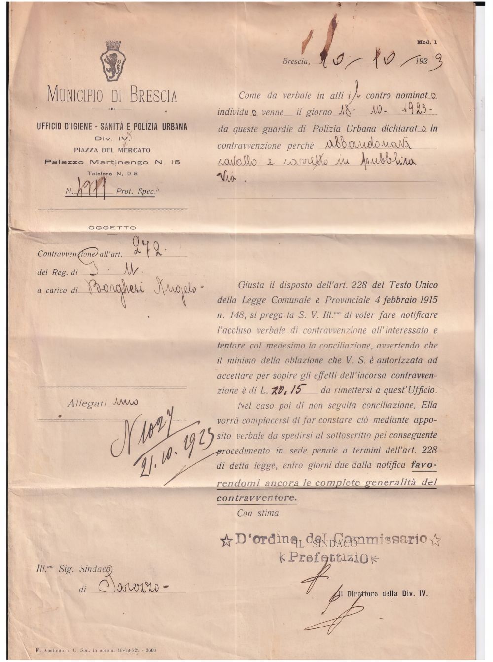 1923-Brescia verbale di contravvenzione del 10.10 per abbandono di cavallo e carretto in pubblica via