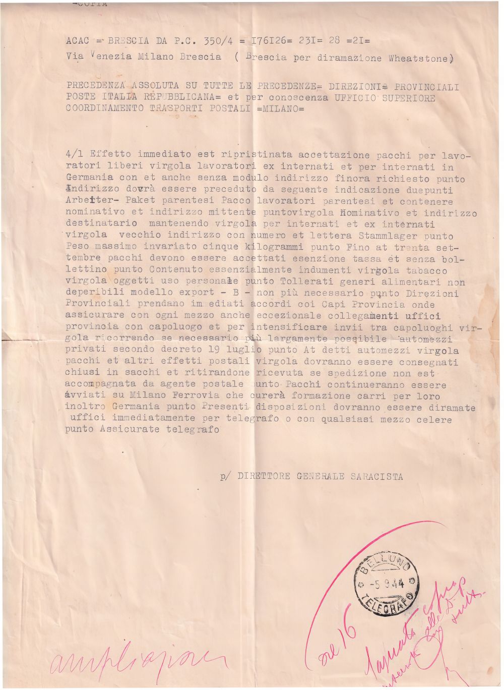 1944-RSI dispaccio urgente per la posta centrale di Brescia ripristino accettazione pacchi dei lavoratori italiani internati in Germania
