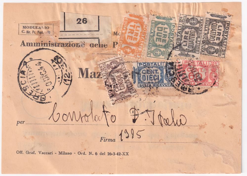 Mazzo etichettato affrancato con pacchi frazionati Brescia 30.12.44