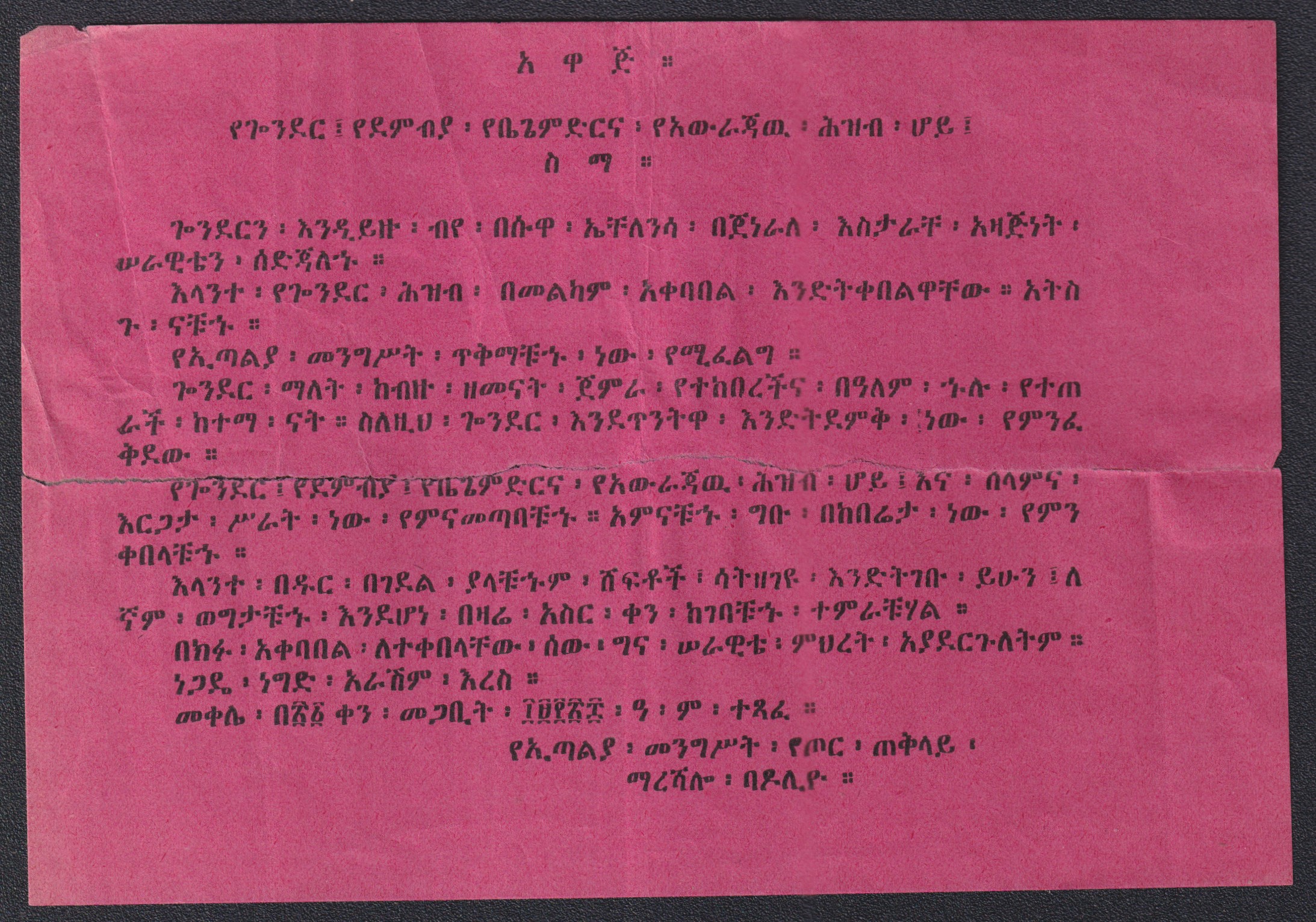 1928-Volantino in amarico del maresciallo Badoglio sull'entrata in Gondar, raro anche se presenta uno strappo orizzontale ricostruito