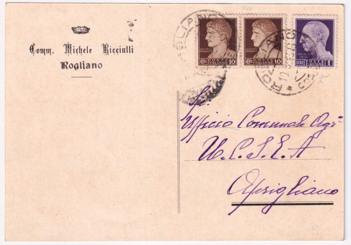 1945-Imperiale Senza Fasci lire 1 e coppia c.10 (519/0) su cartolina Rogliano 10.6 ( Re di maggio). Firmato Chiavarello