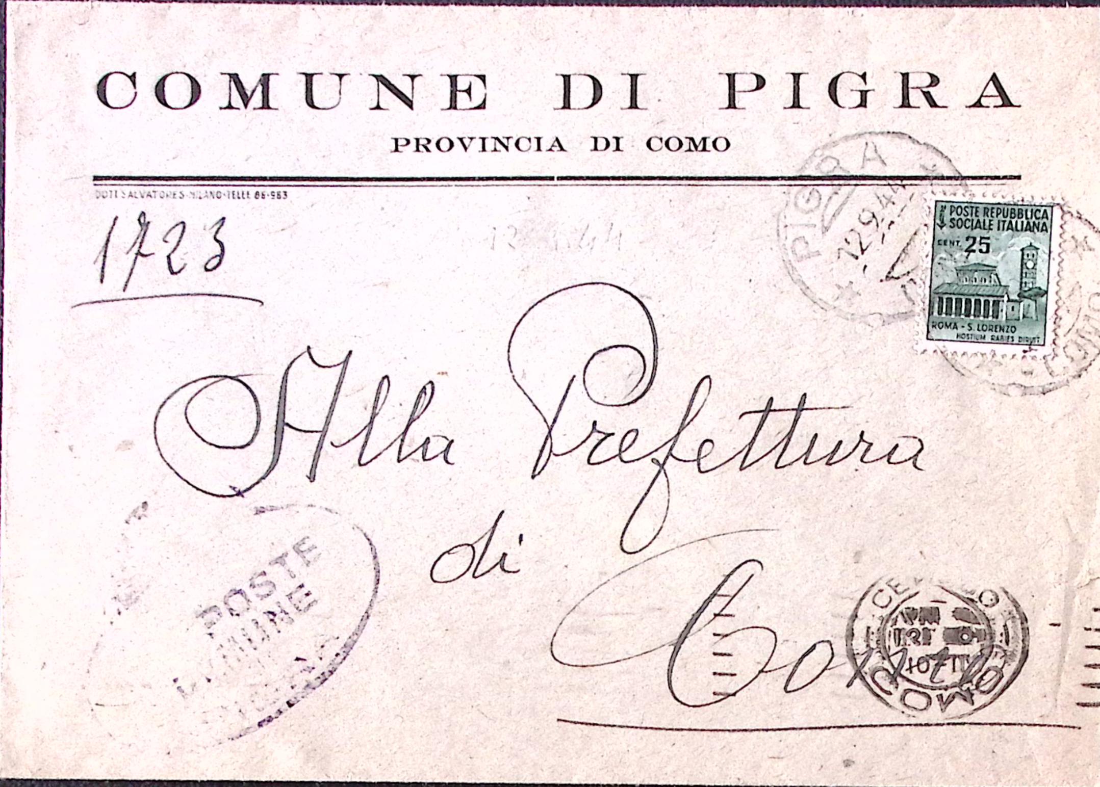 1944-Monumenti c.25 (505) isolato su busta Pigra (12.9) tariffa agevolata sindaci