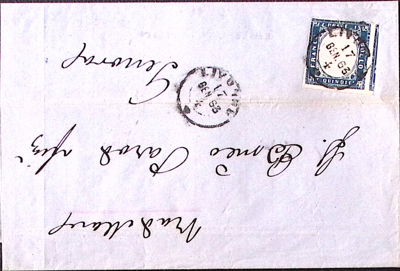 1863-TIPO IV SARDEGNA c.15 (11 un margine a filo) isolato su soprascritta Livorno (17.1)