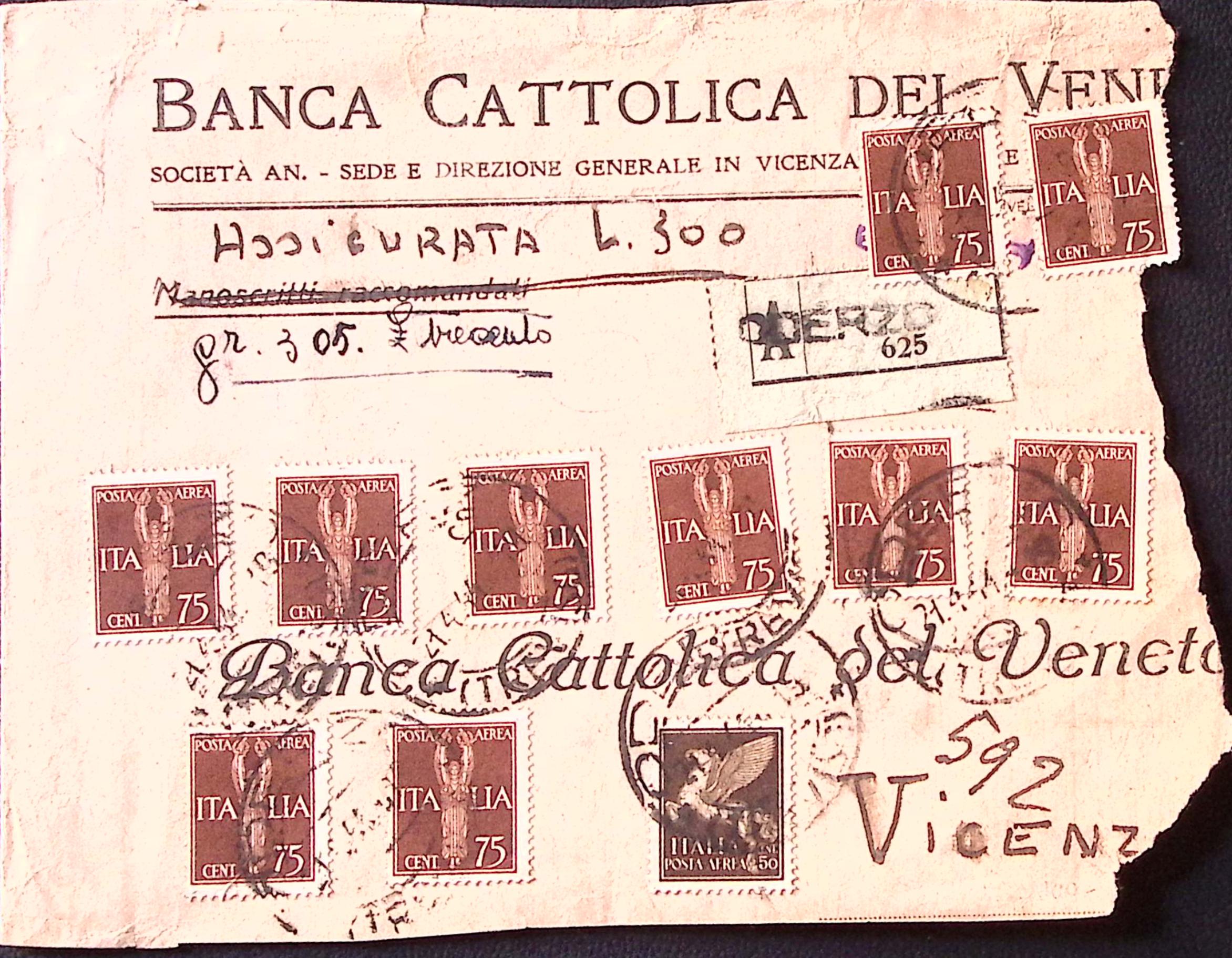 1944-Posta aerea c.50 e dieci c.75 (11/2) su frontespizio di assicurata Oderzo (21.4)