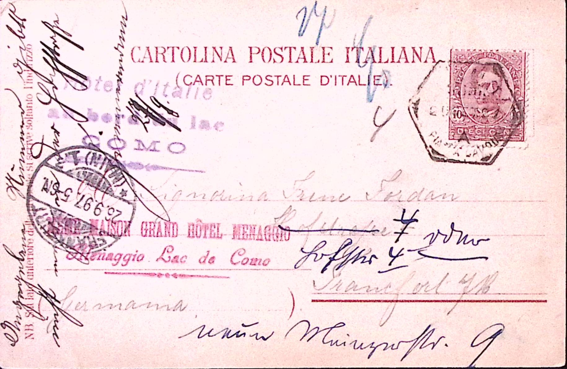 1897-COMO/A/P.ZZA CAVOUR ann. esagonale collettoria (25.9)) su cartolina con 4 belle vedute del Lago di Como, per la Germania