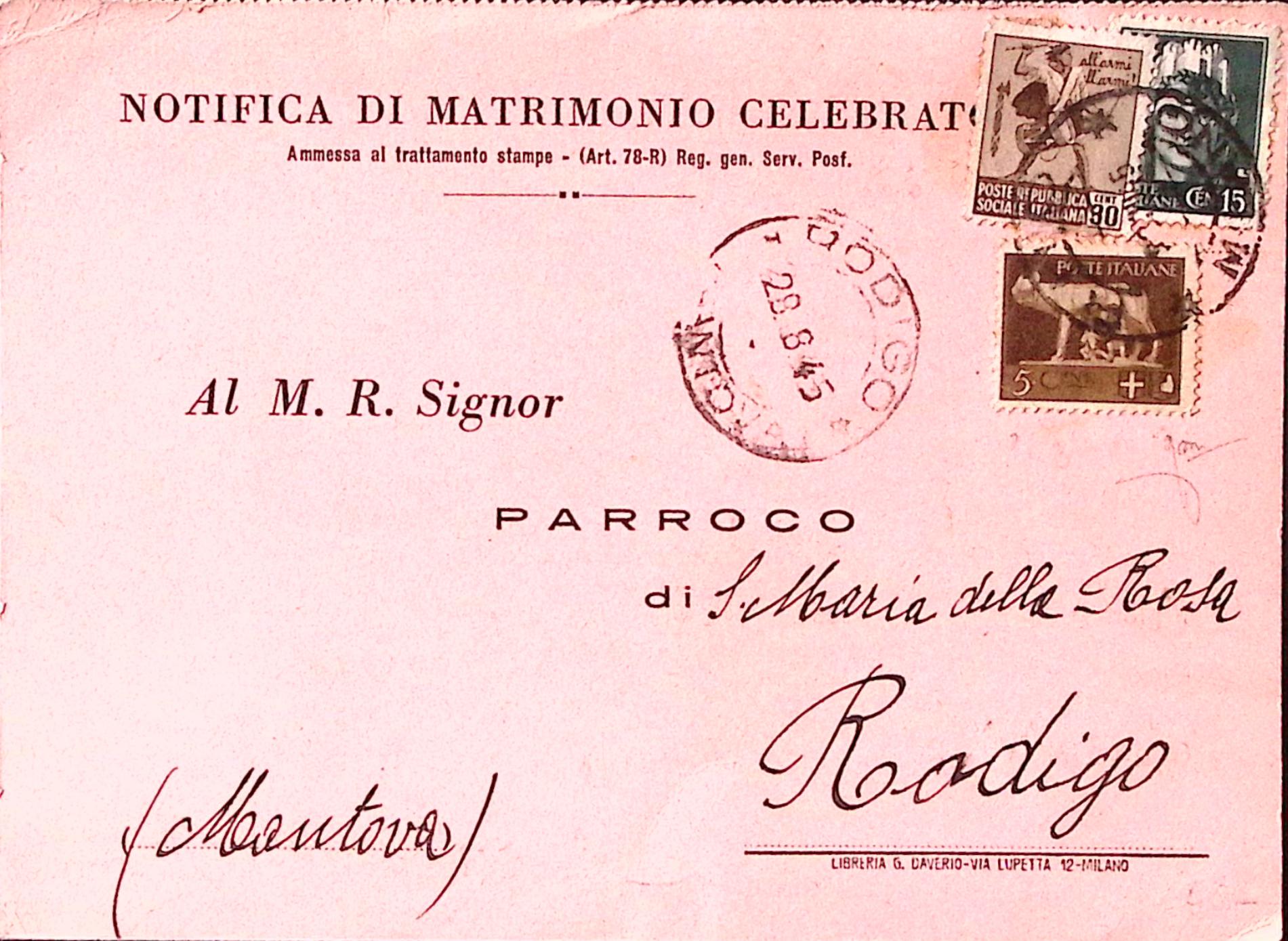 1945-Imperiale c.5, 15 + Monumenti c.30 su notif. matrimoniale Rodigo (28.8.45)