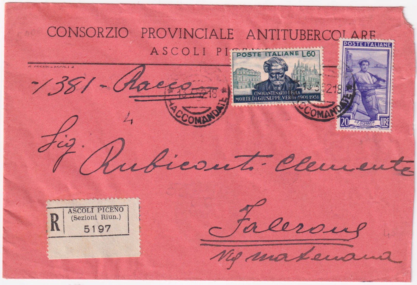 1952-VERDI lire 60 + ITALIA LAVORO lire 20 (642+679) su raccomandata Ascoli (13.3)