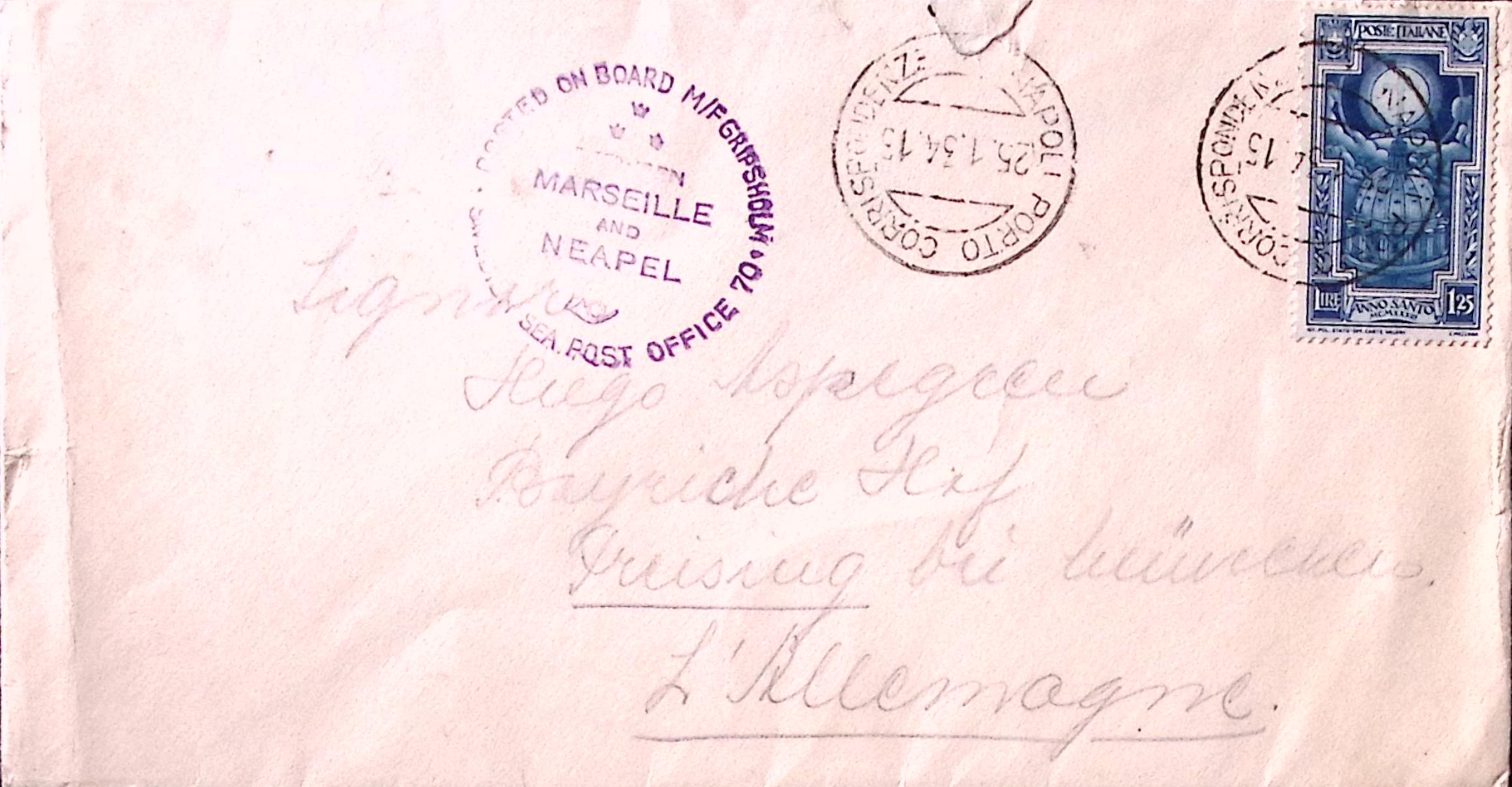 1934-Posted on board M/F Gripsholm /Marseille and Neapel/Post Office 70 tondo su busta affrancata Anno Santo lire 1,25 (25.1) per la Germania