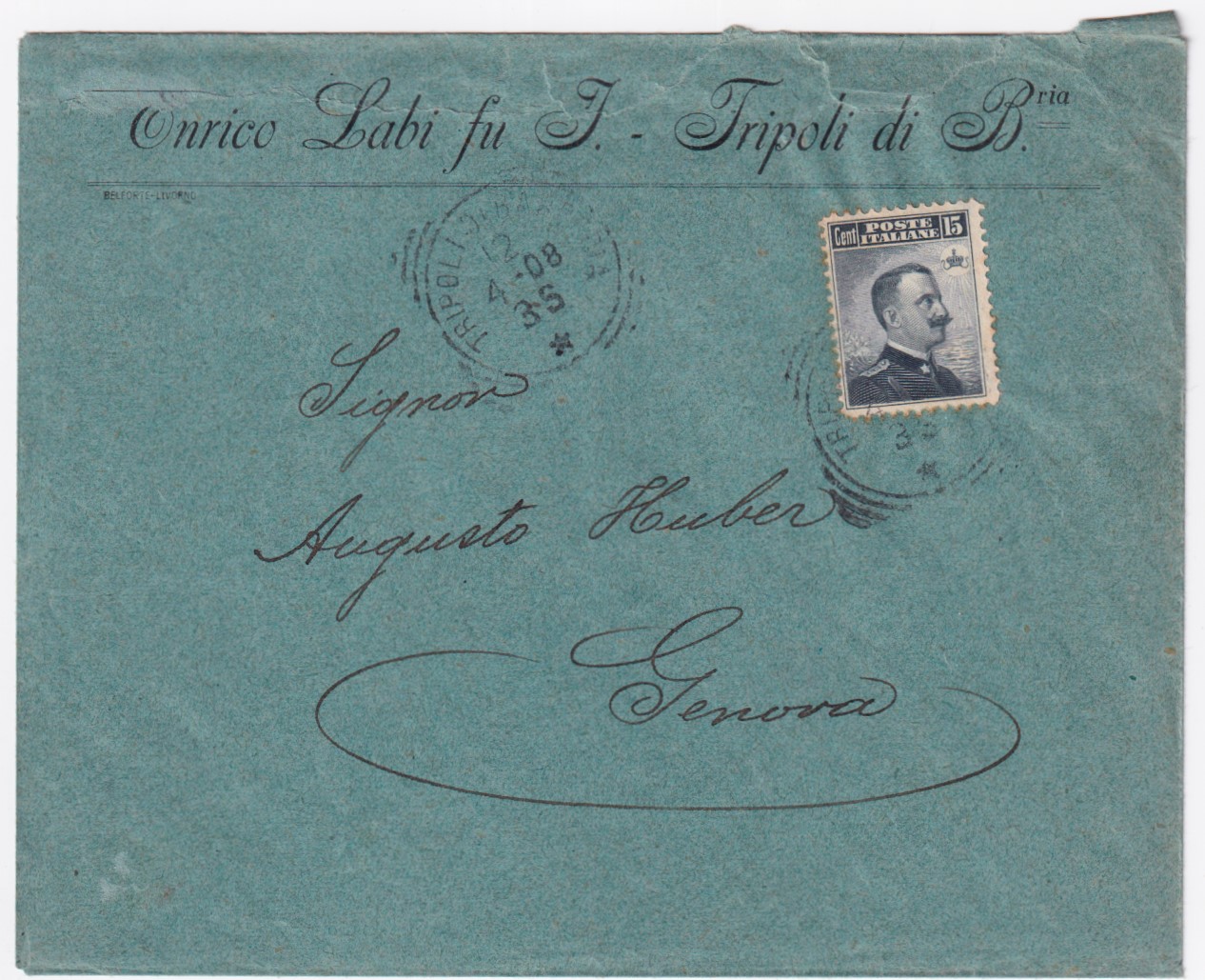 1908-TRIPOLI DI BARBERIA tondo riquadrato (12.4) su busta affr. Michetti c.15