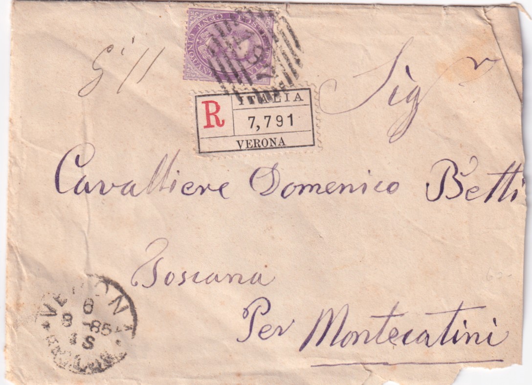 1885-effigie c.50 (42) isolato su raccomandata Verona (6.8)