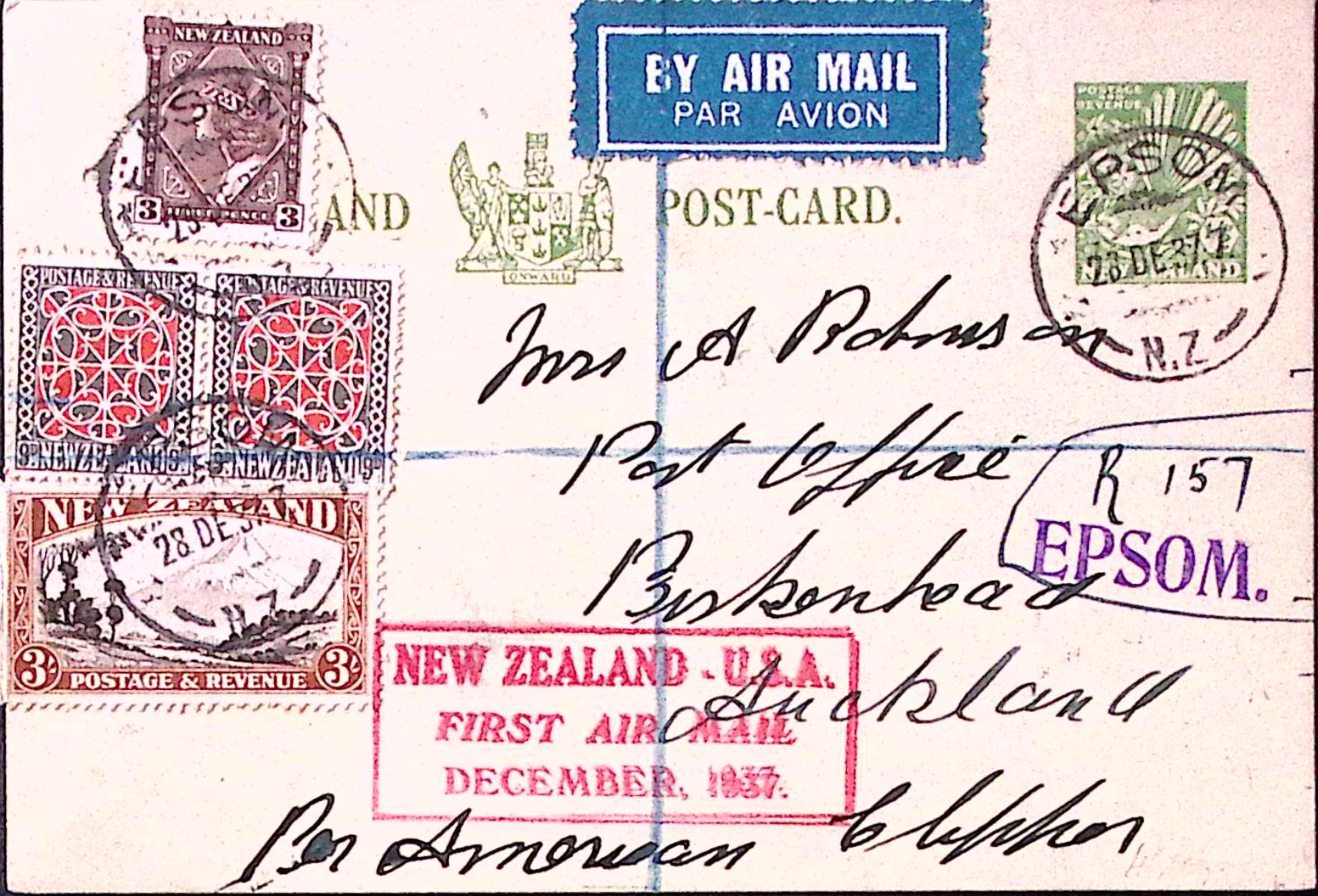 1937-I^volo Nuova Zelanda-USA1937 su cartolina postale p.0,5 con fr.lli aggiunti raccomandata via aerea Epsom (28.12)