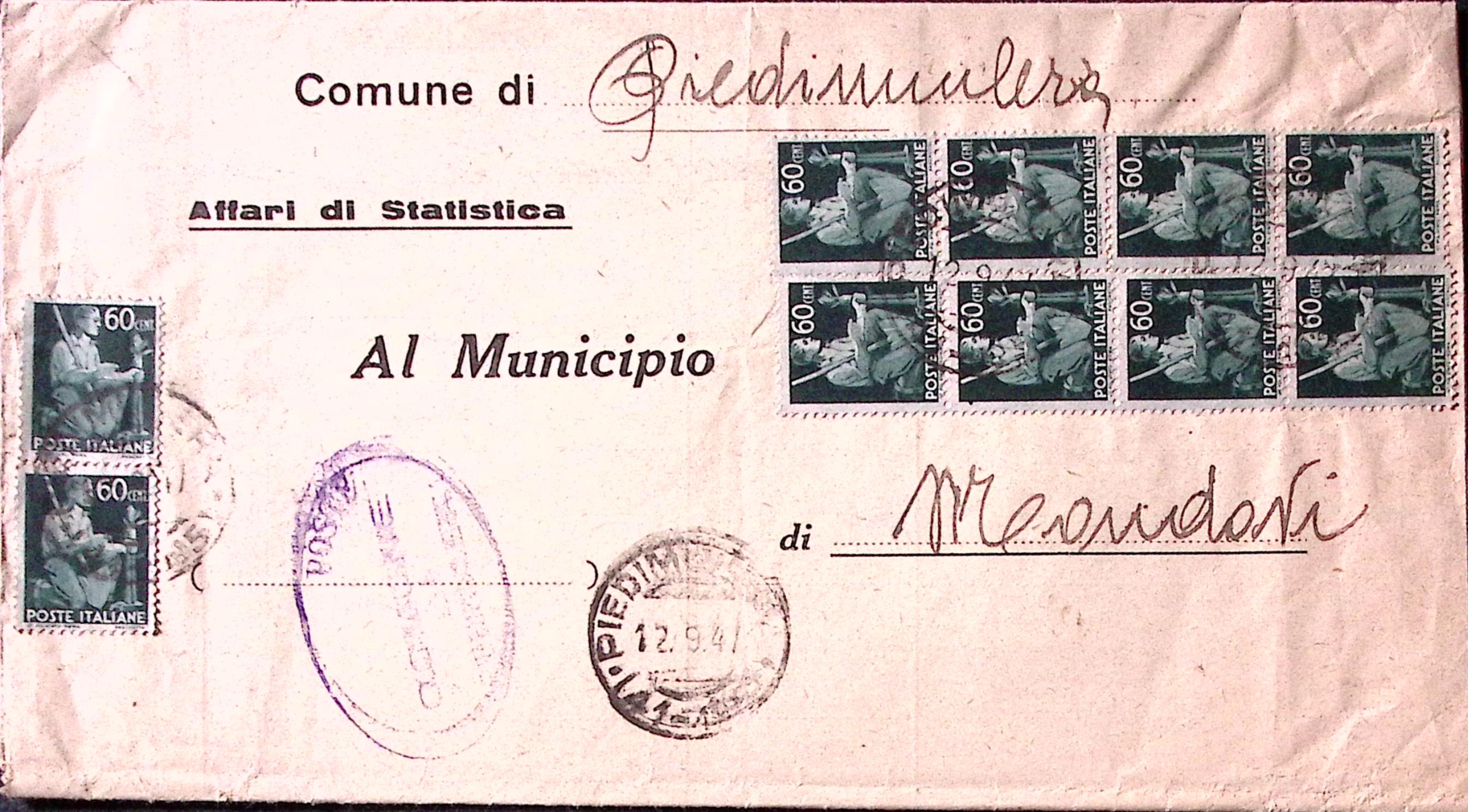 1947-Democratica coppia e blocco otto c.60 (548) su piego Piedimulera (12.9) per Mondovì e rispedito affr. Democratica lire 3 (16.10)