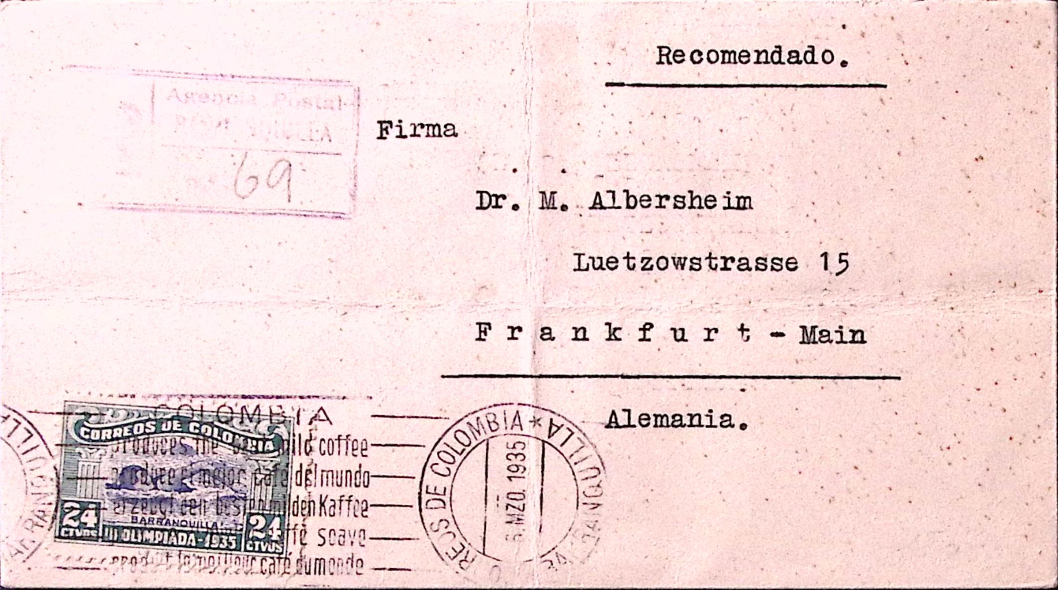1935-Colombia 3 Giochi olimpici sudamericani c.24 (284) isolato su raccomandata Barranquilla (6.3) per la Germania
