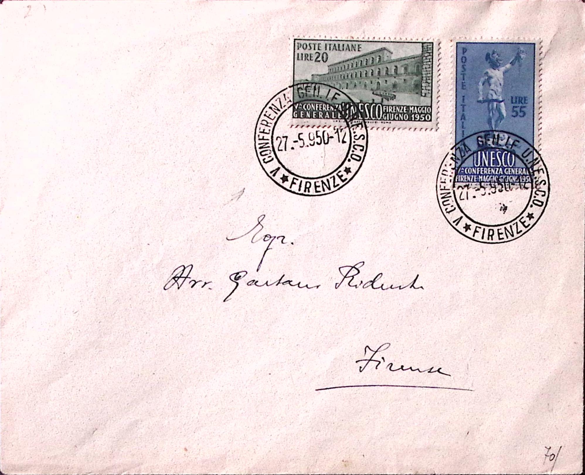 1950-FIRENZE V Conferenza Gen. UNESCO (27.5) annullo speciale su busta affrancata serie completa UNESCO