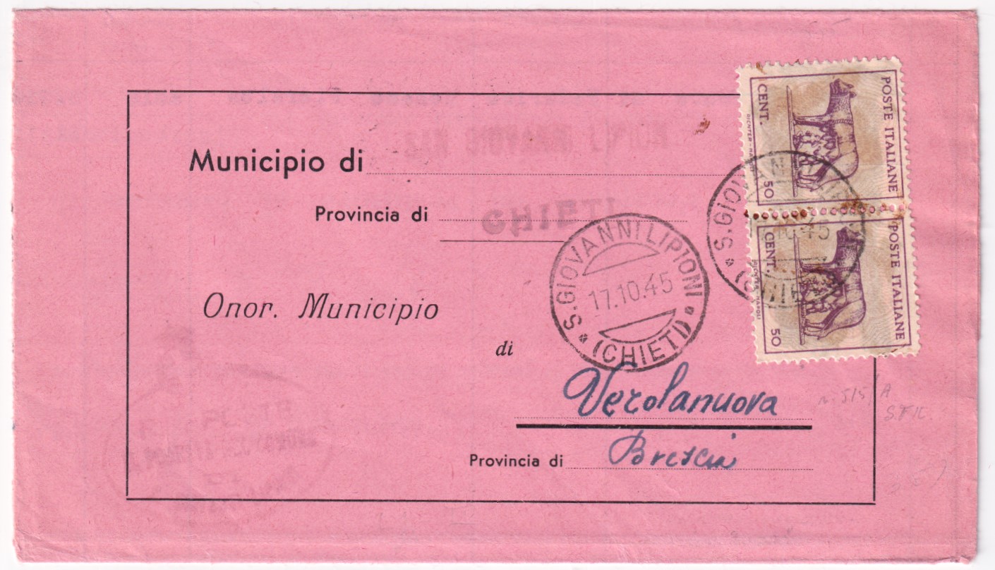 1945-LUPA coppia c.50 su piego S Giovanni Lipioni/Chieti (17.10)